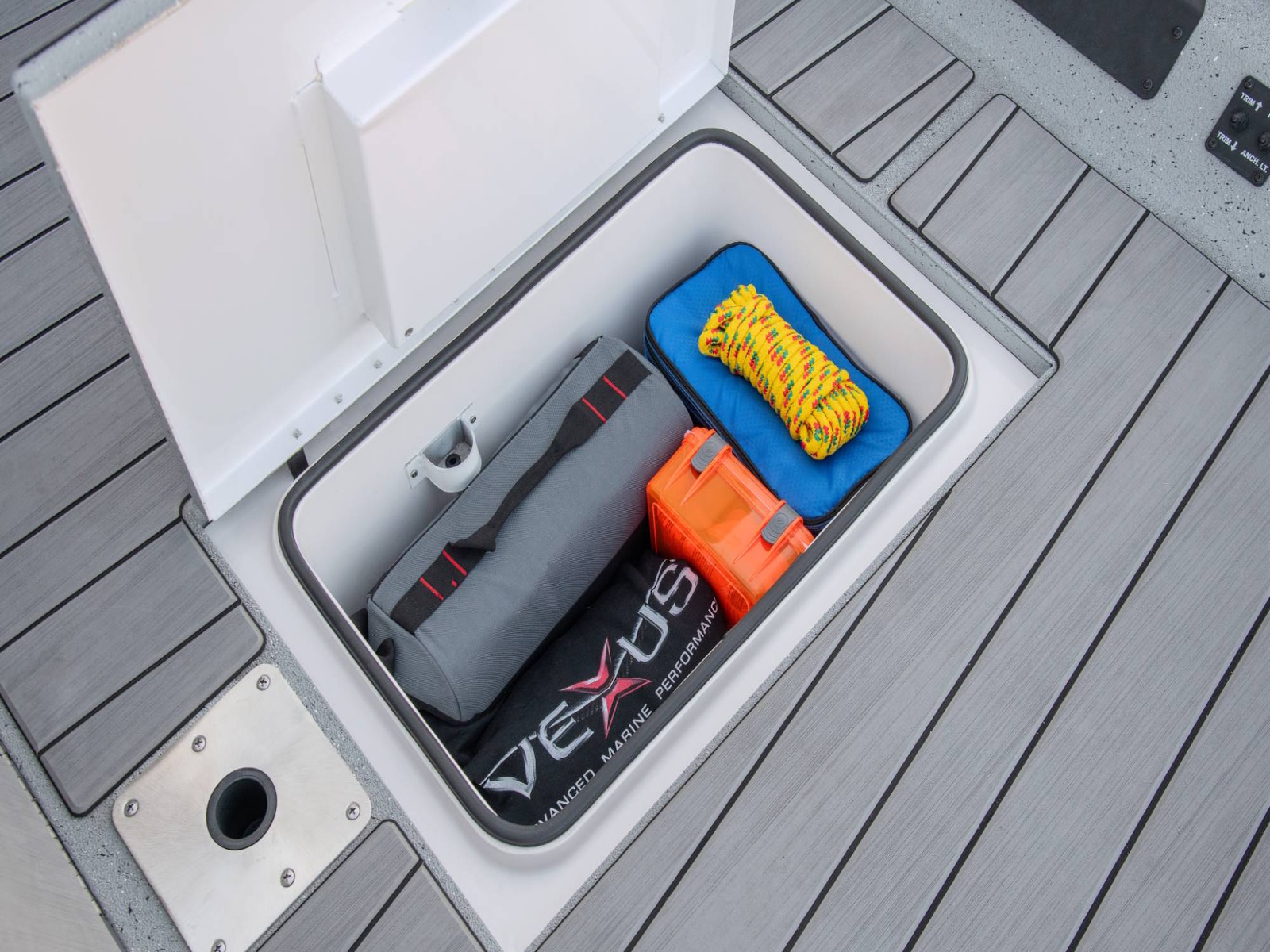 The ACX2210 features an oversized fish box that can double as a drink/snack cooler. Insulated and big enough to ice down your limit, the box incorporates a side drain so you can clean it without scales and other debris ending up in your bilge compartment. This fiberglass box also features a smooth, durable gel-coated interior that meets the demands an avid angler will throw at it.