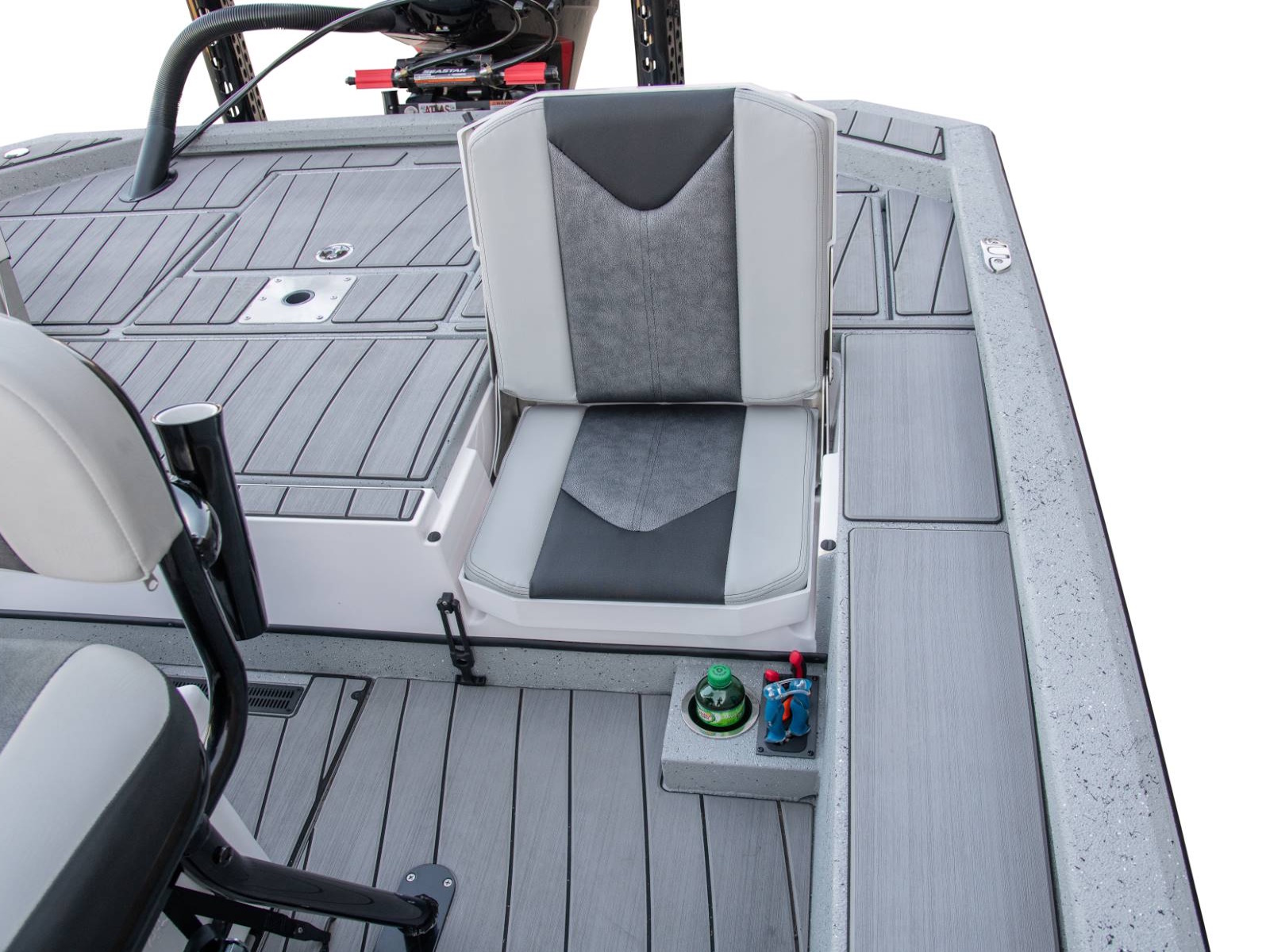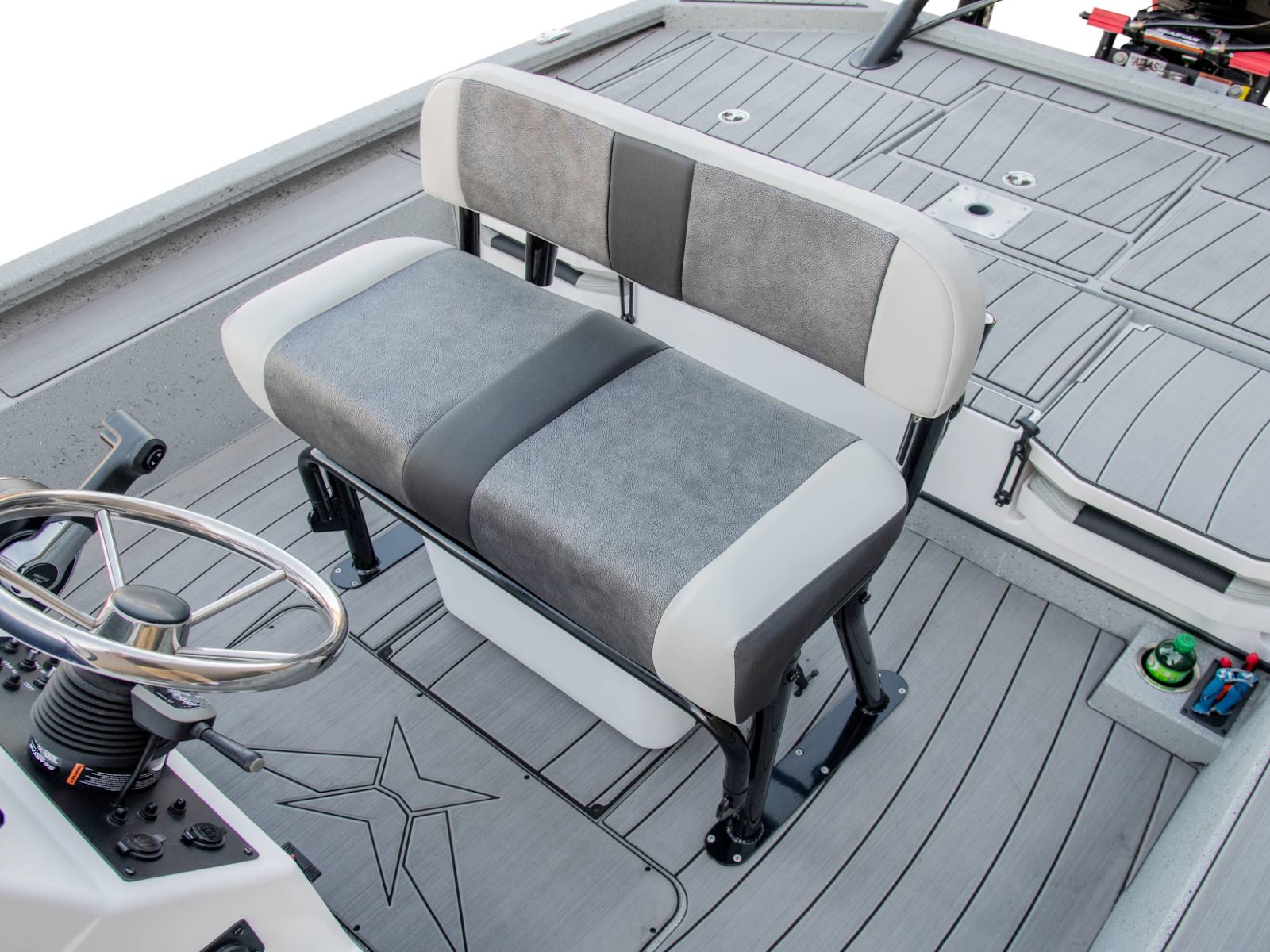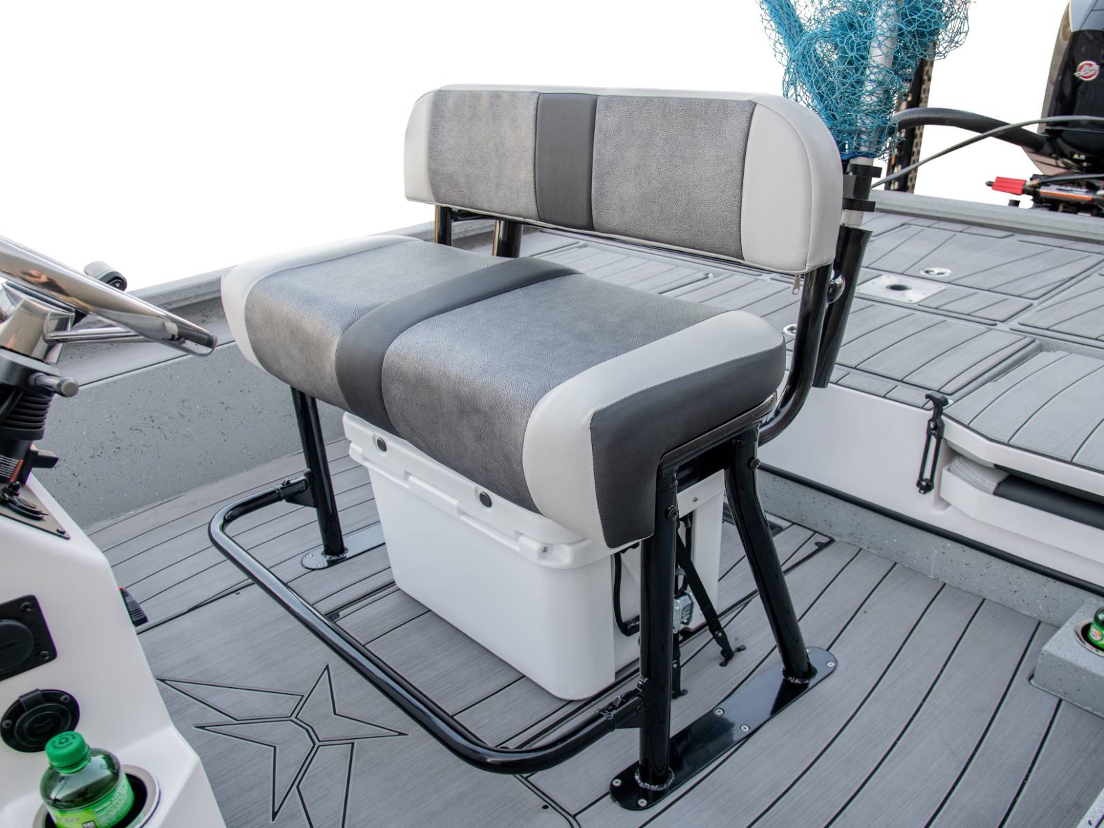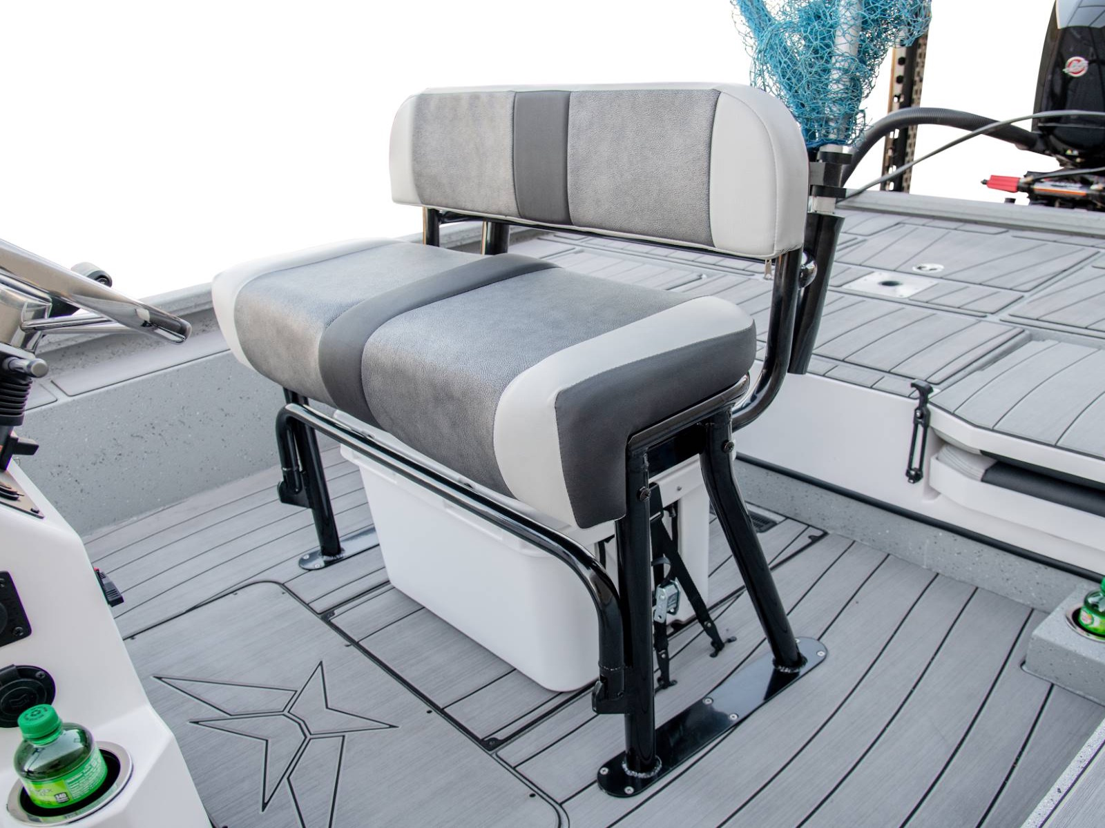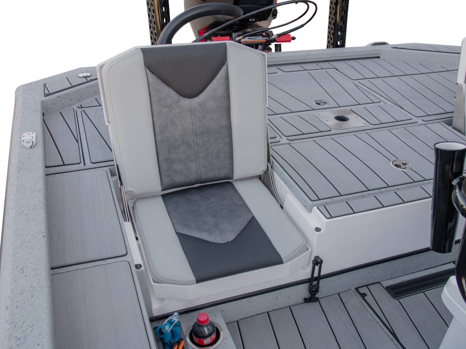 Our custom driver’s seat provides exceptional comfort, stability, and support for long days on the water. With enough room under the seat for an optional 45-quart cooler, your cold drinks and snacks will be close at hand. There’s even an integrated fold-down footrest and anti-fatigue mat for additional comfort.