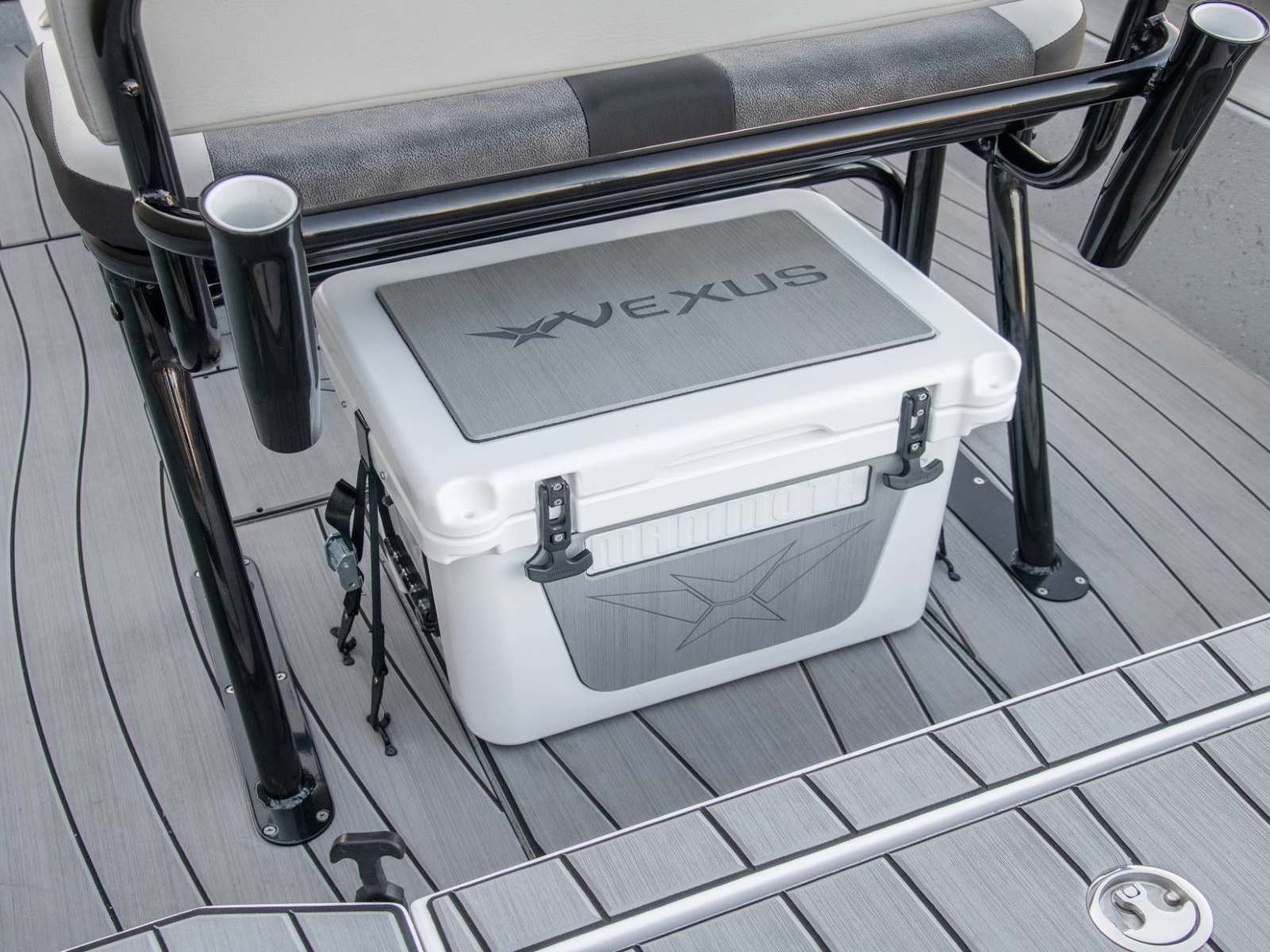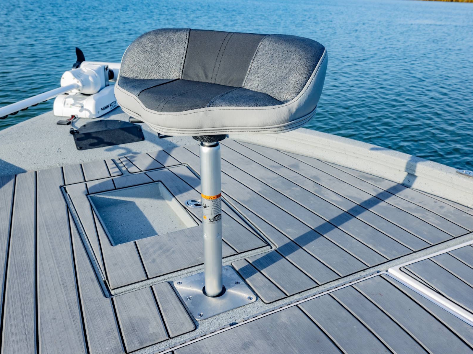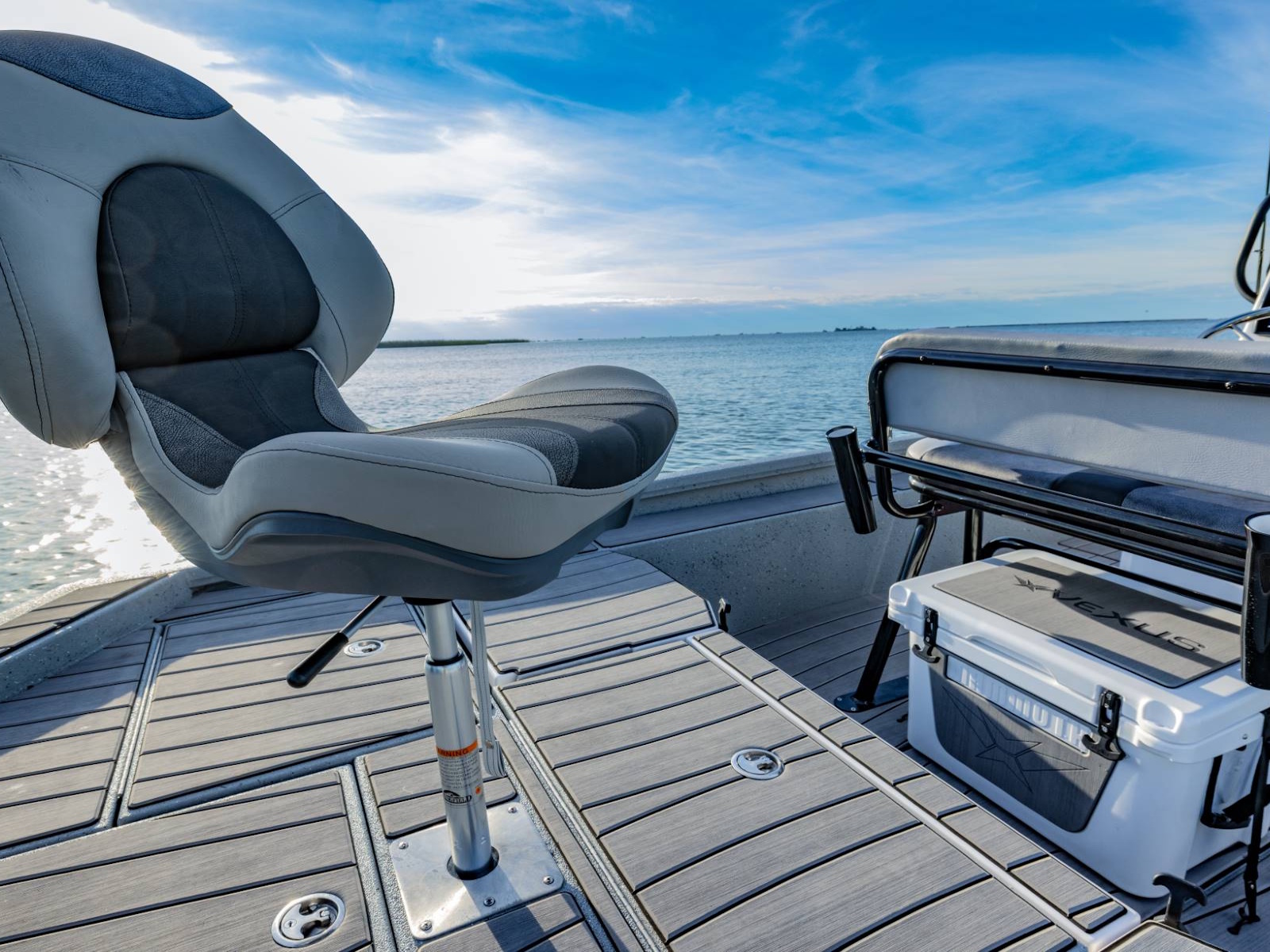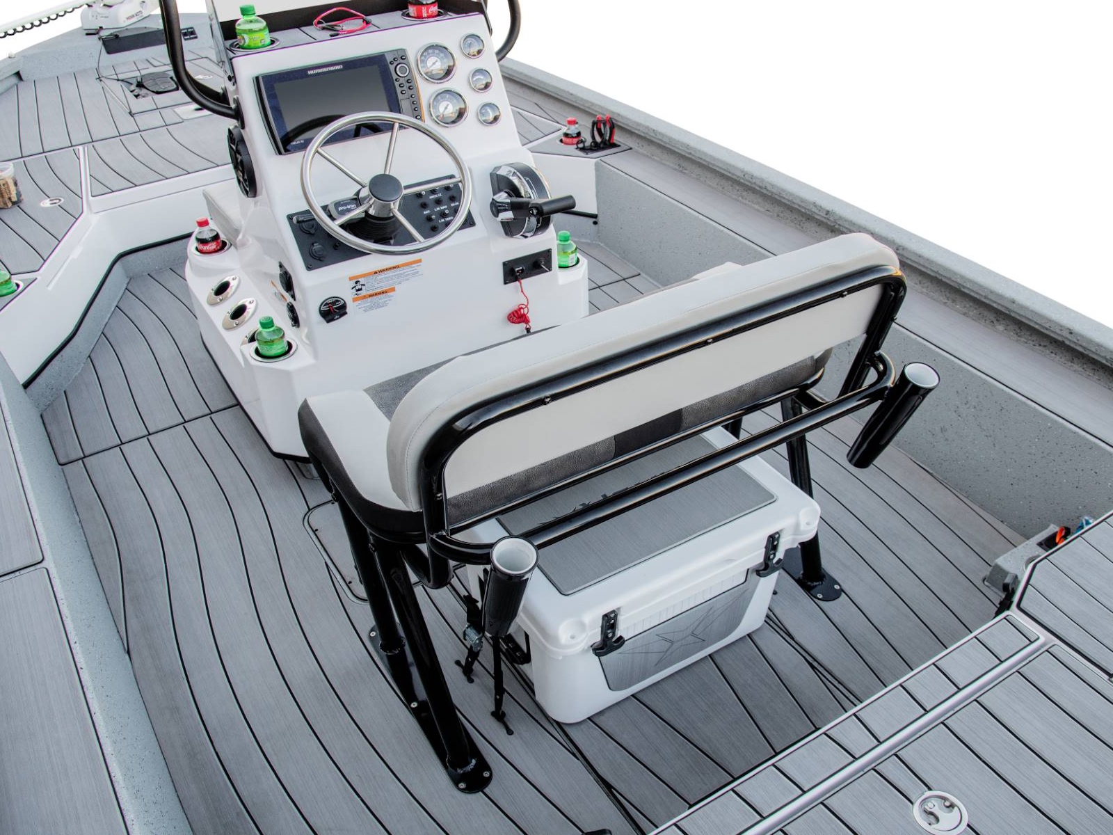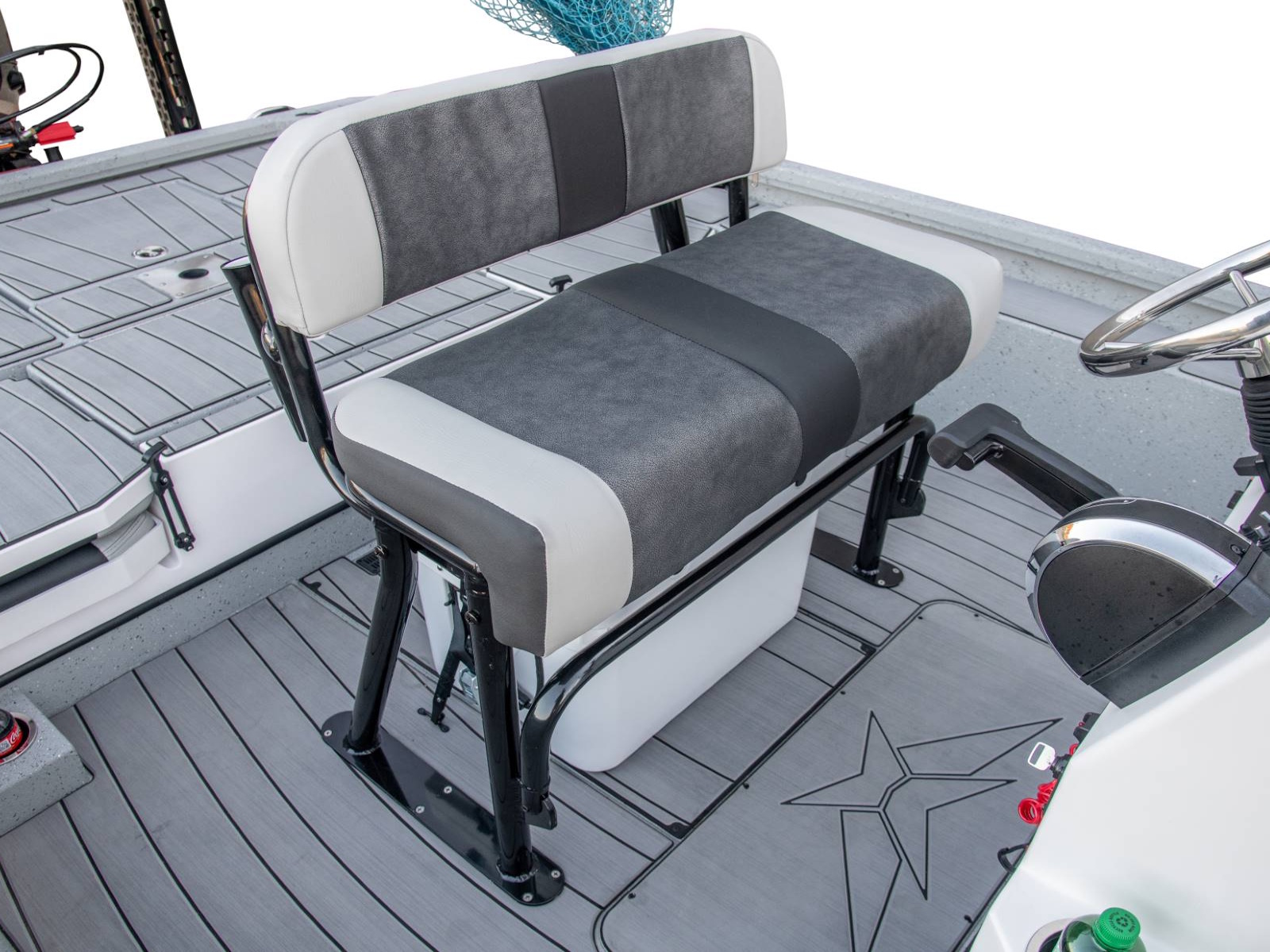 Our custom driver’s seat provides exceptional comfort, stability, and support for long days on the water. With enough room under the seat for an optional 45-quart cooler, your cold drinks and snacks will be close at hand. There’s even an integrated fold-down footrest and anti-fatigue mat for additional comfort.