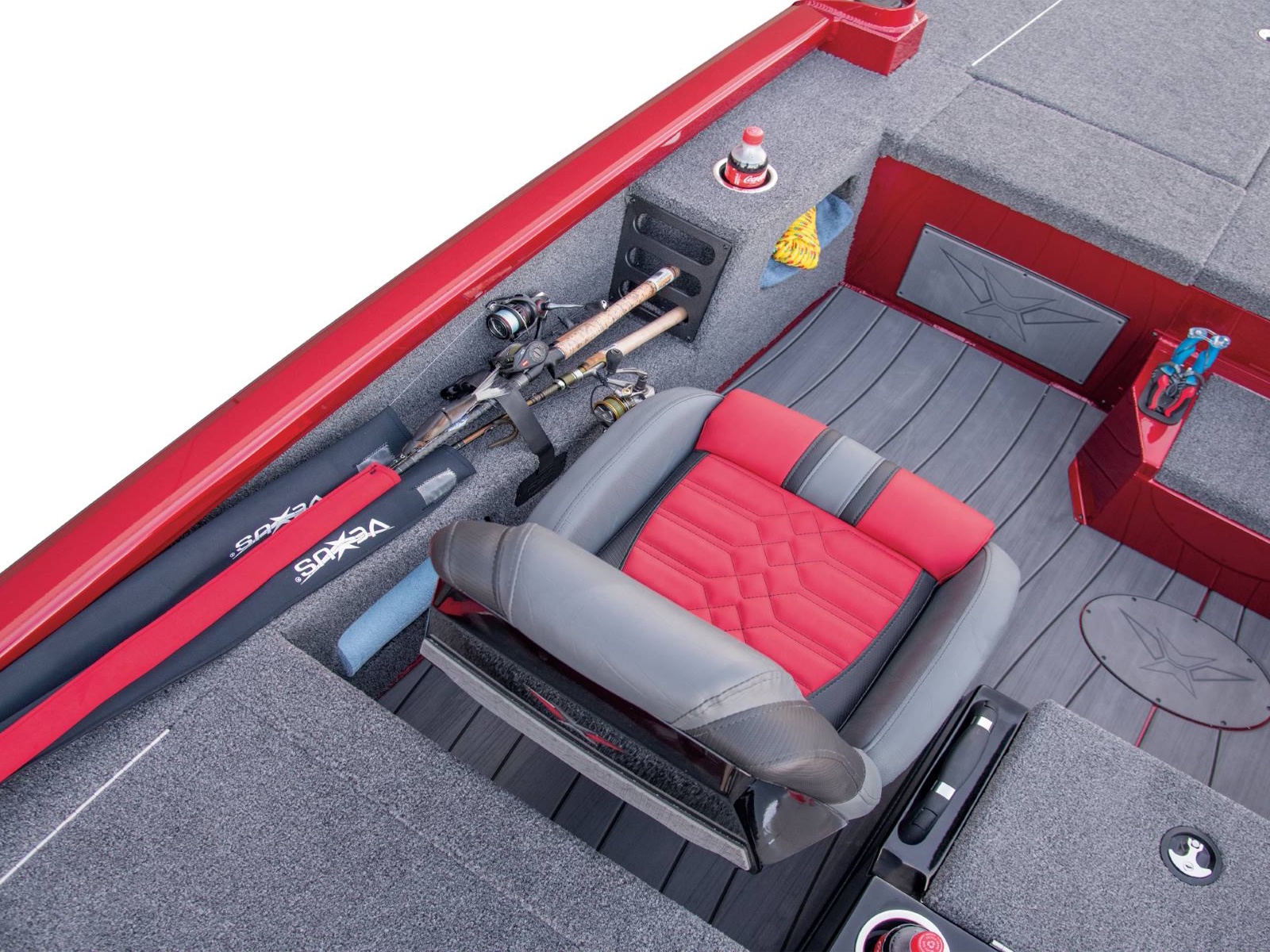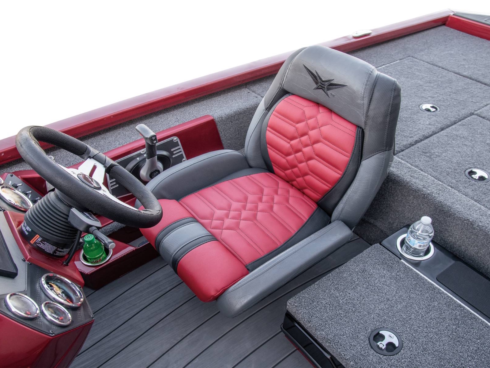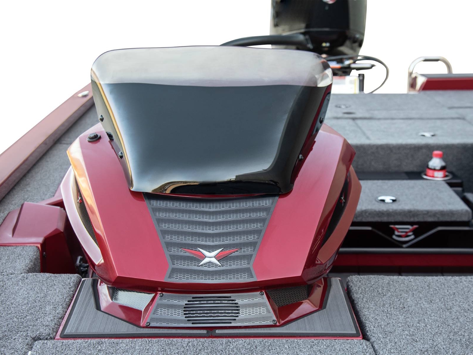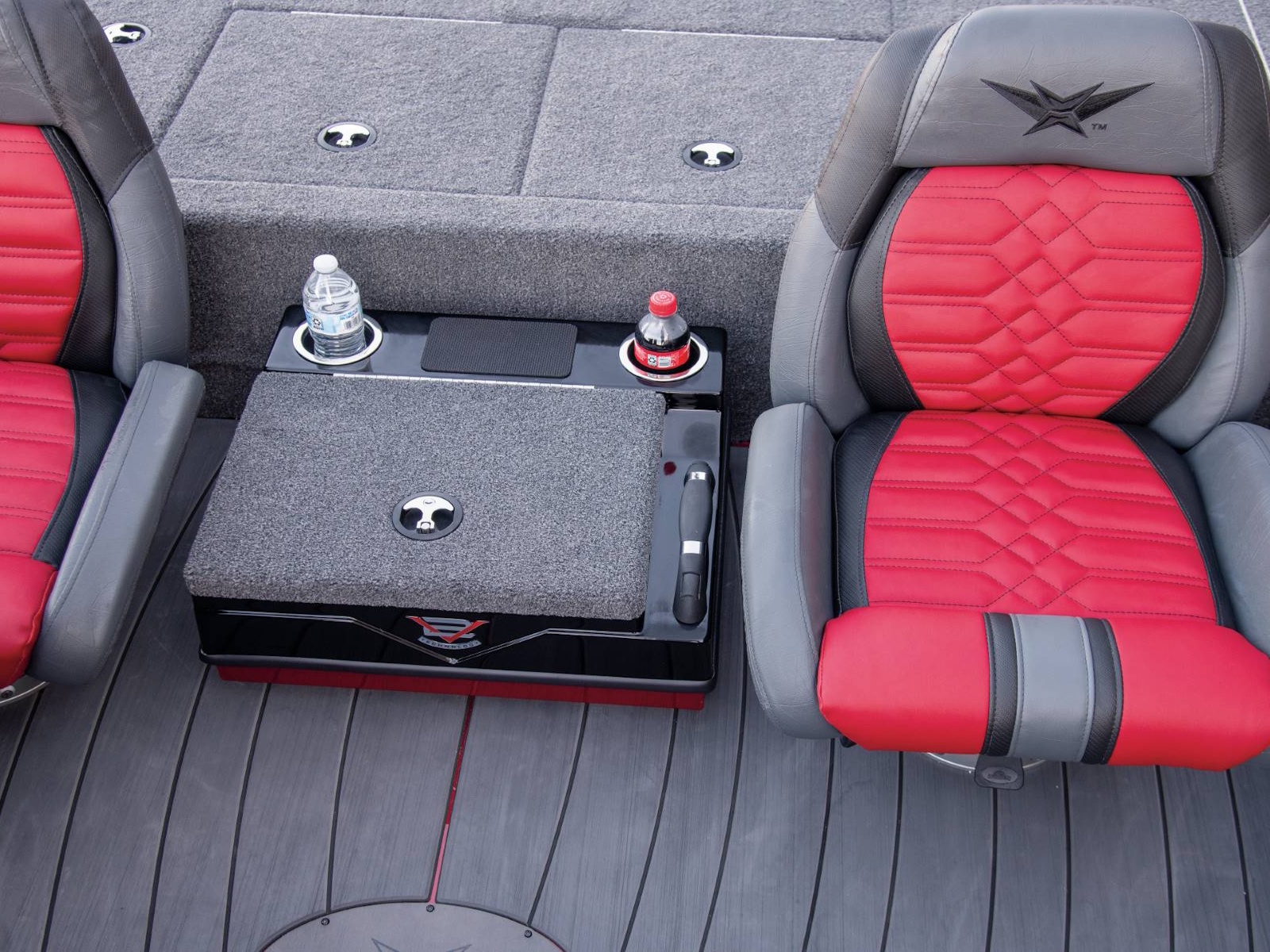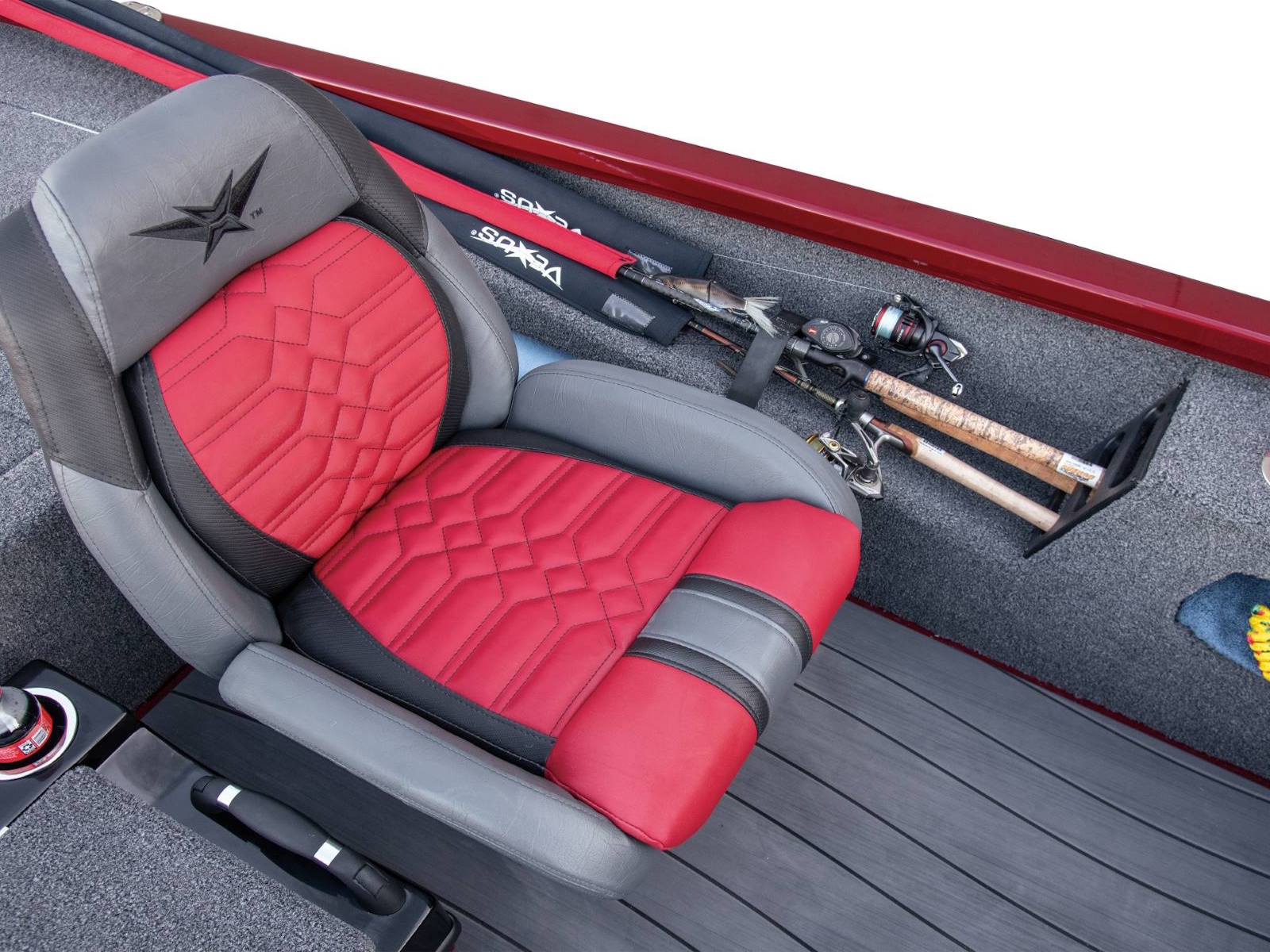 Leading up to the front deck is a small step and storage box with toolholders. It’s a handy position and easy to access from virtually anywhere in the boat. The cockpit, itself, is wide open and highlighted by a world of leg room, adjustable high performance seating with fiberglass shells, integrated side storages, cup holders, an ambidextrous net holder behind the seats, and a running rod rack for fast access to even more rods. Smooth, SeaStar™ Pro hydraulic steering centers the helm while the custom-styled glass console includes your choice of electronics as well as speed, tach, fuel, trim, and water pressure instrumentation. In between the driver and passenger seating, an available center step with storage is designed with cup holders, a compression latch, and support handle.