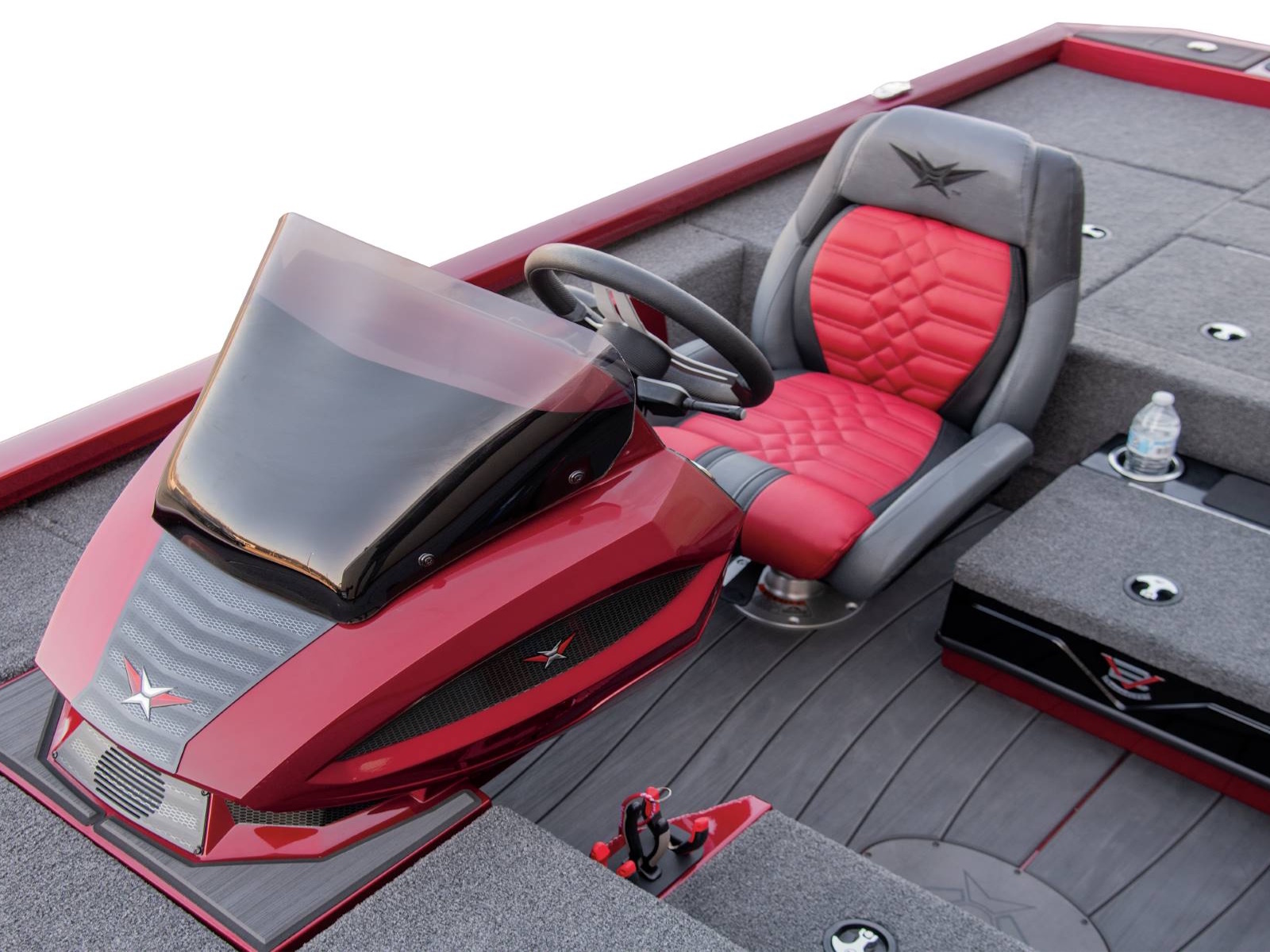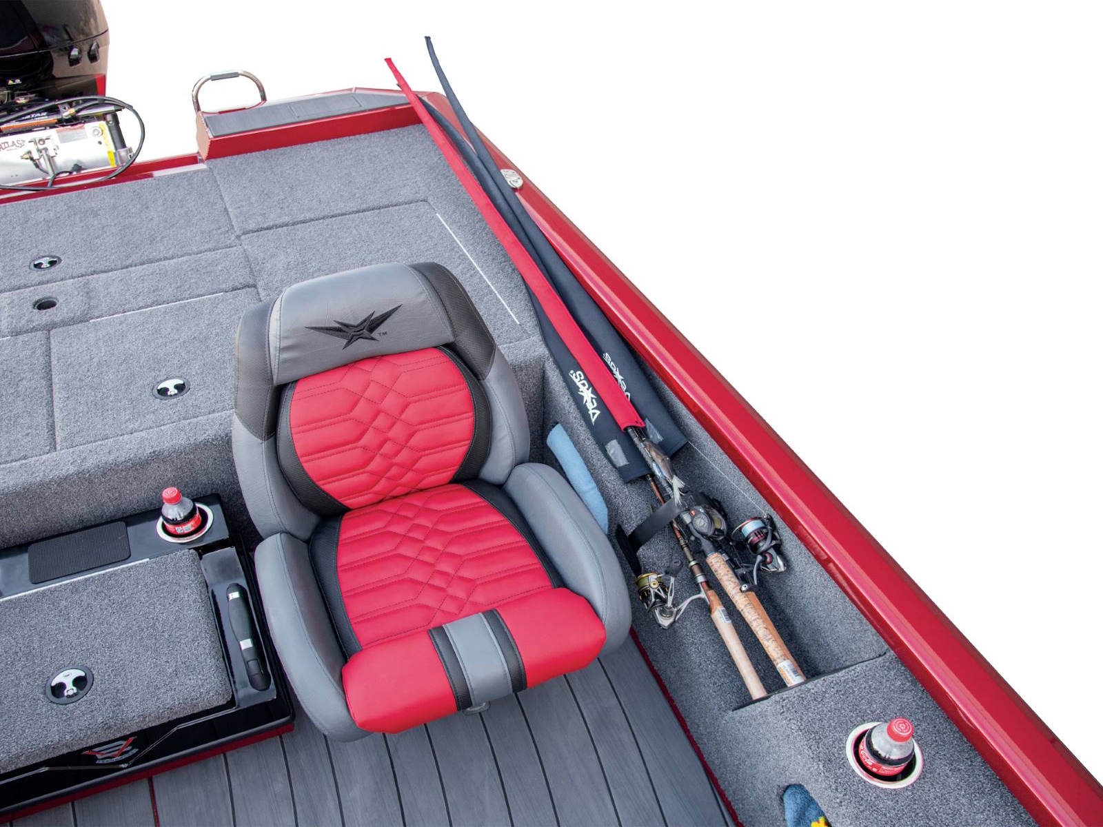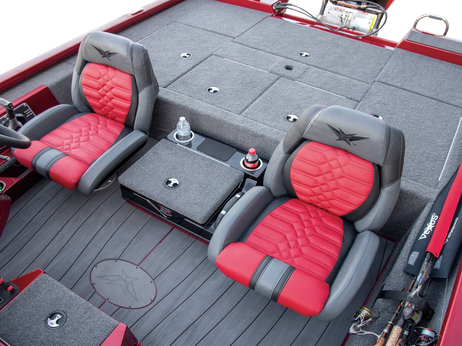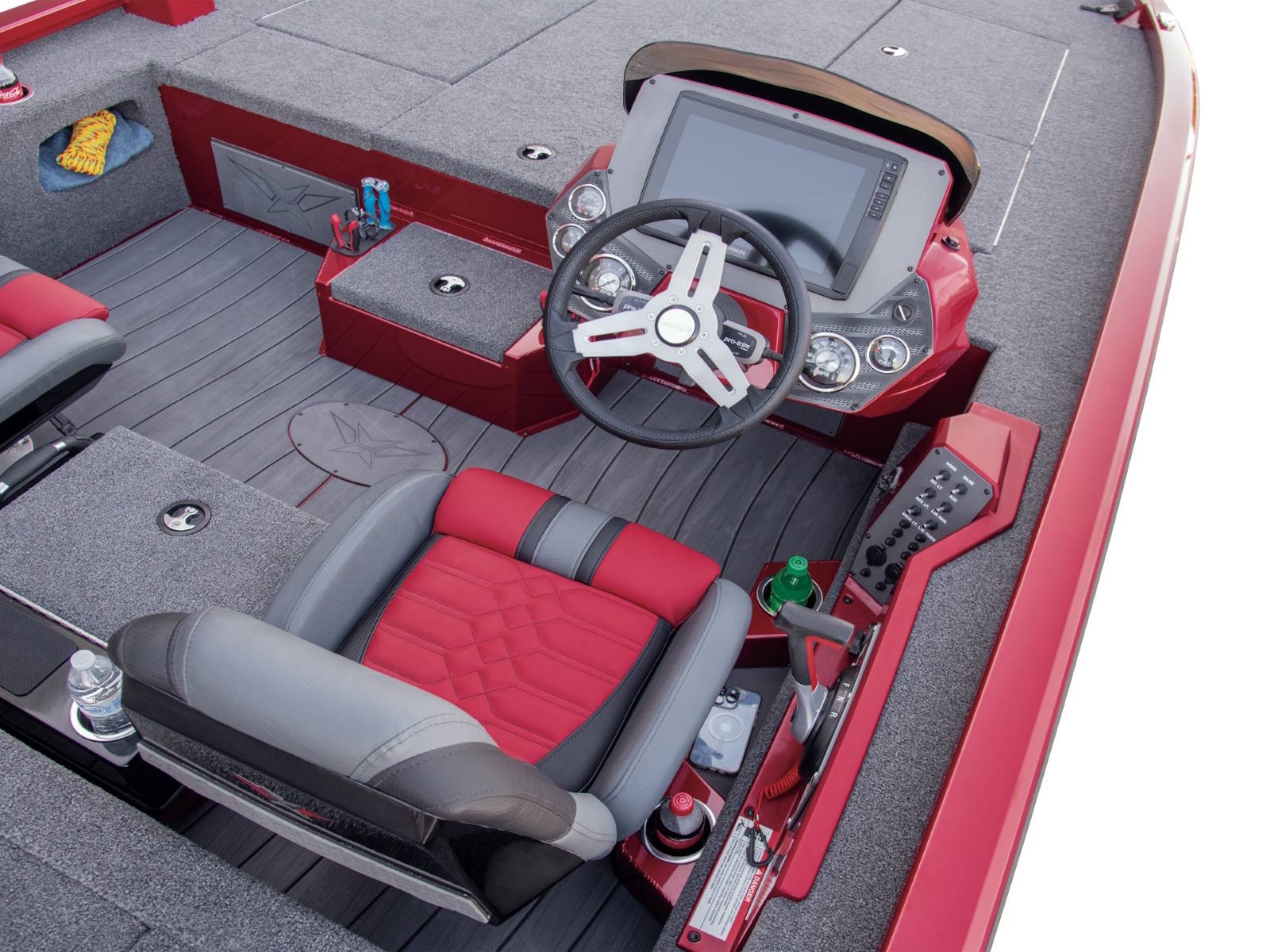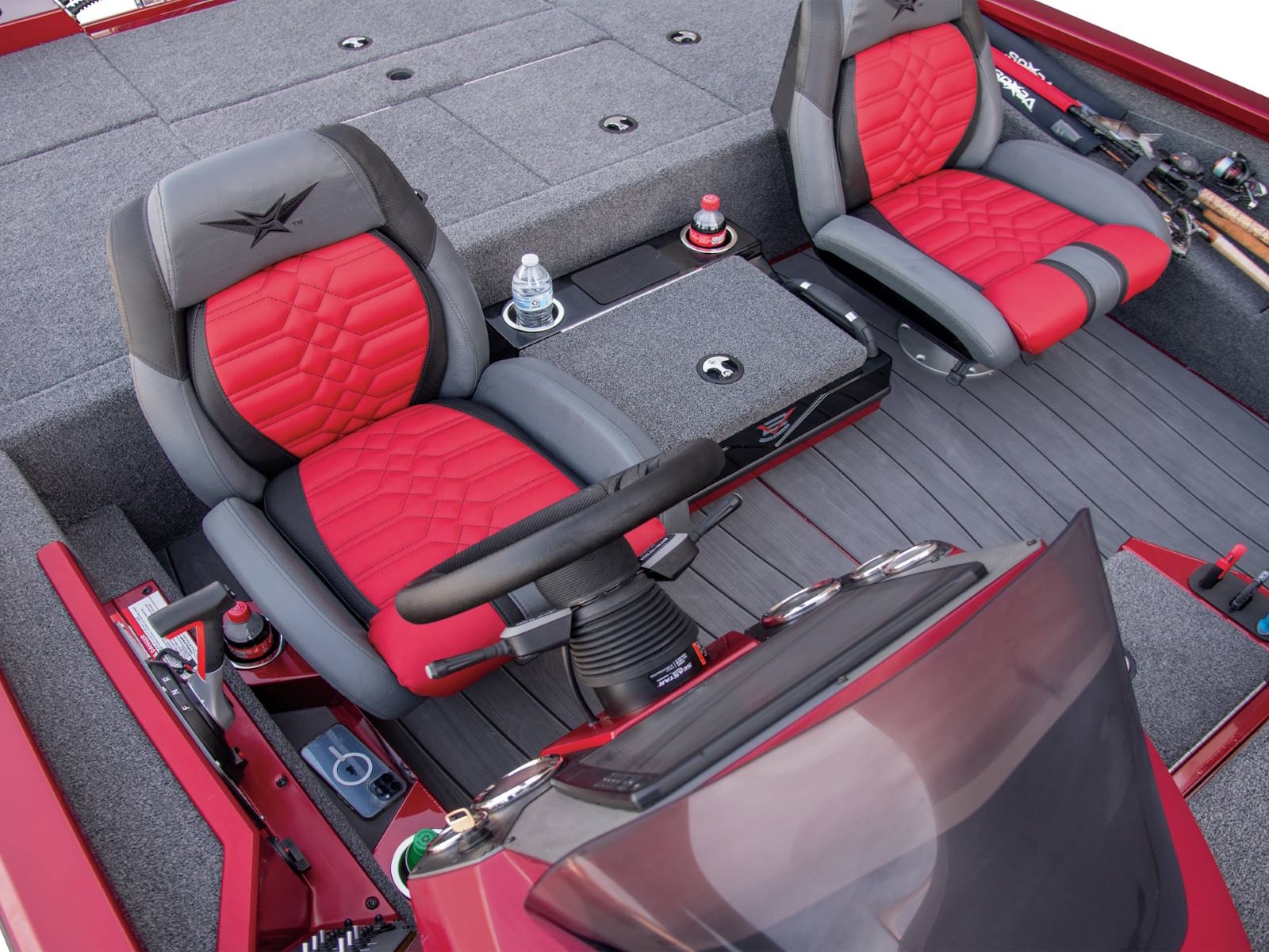 Leading up to the front deck is a small step and storage box with toolholders. It’s a handy position and easy to access from virtually anywhere in the boat. The cockpit, itself, is wide open and highlighted by a world of leg room, adjustable high performance seating with fiberglass shells, integrated side storages, cup holders, an ambidextrous net holder behind the seats, and a running rod rack for fast access to even more rods. Smooth, SeaStar™ Pro hydraulic steering centers the helm while the custom-styled glass console includes your choice of electronics as well as speed, tach, fuel, trim, and water pressure instrumentation. In between the driver and passenger seating, an available center step with storage is designed with cup holders, a compression latch, and support handle.