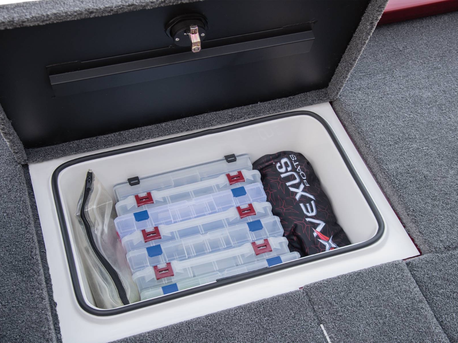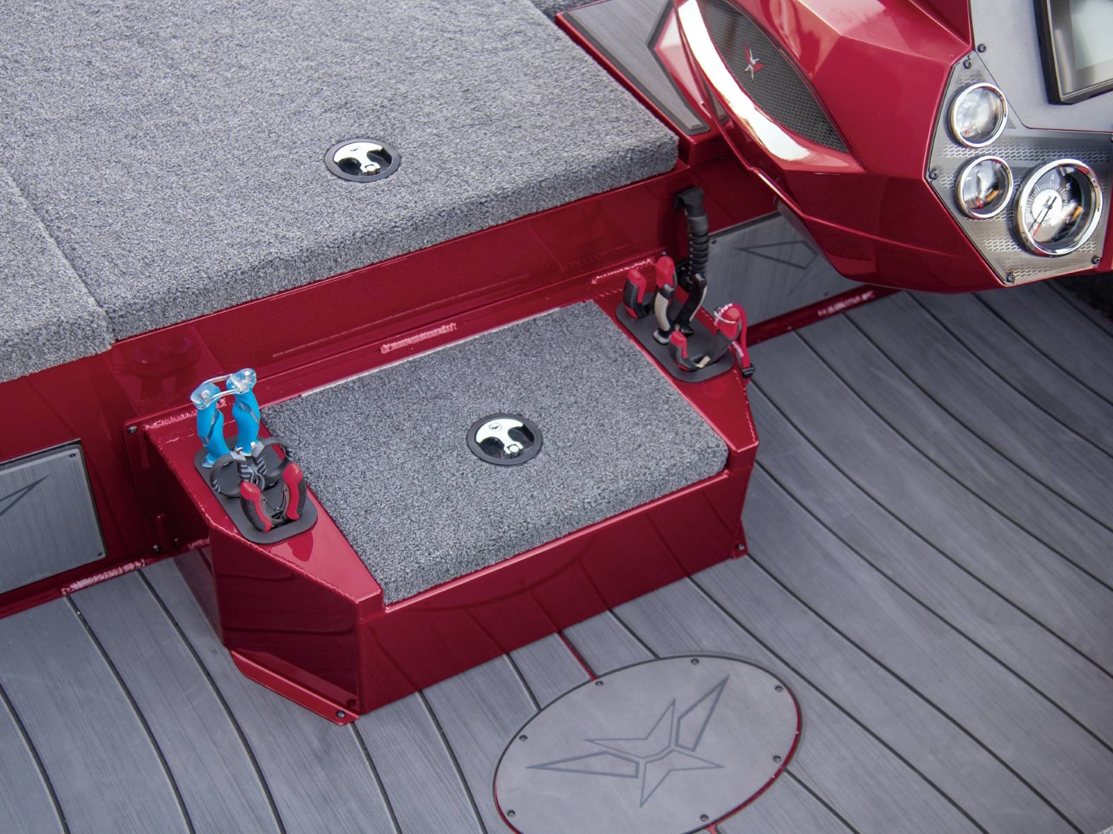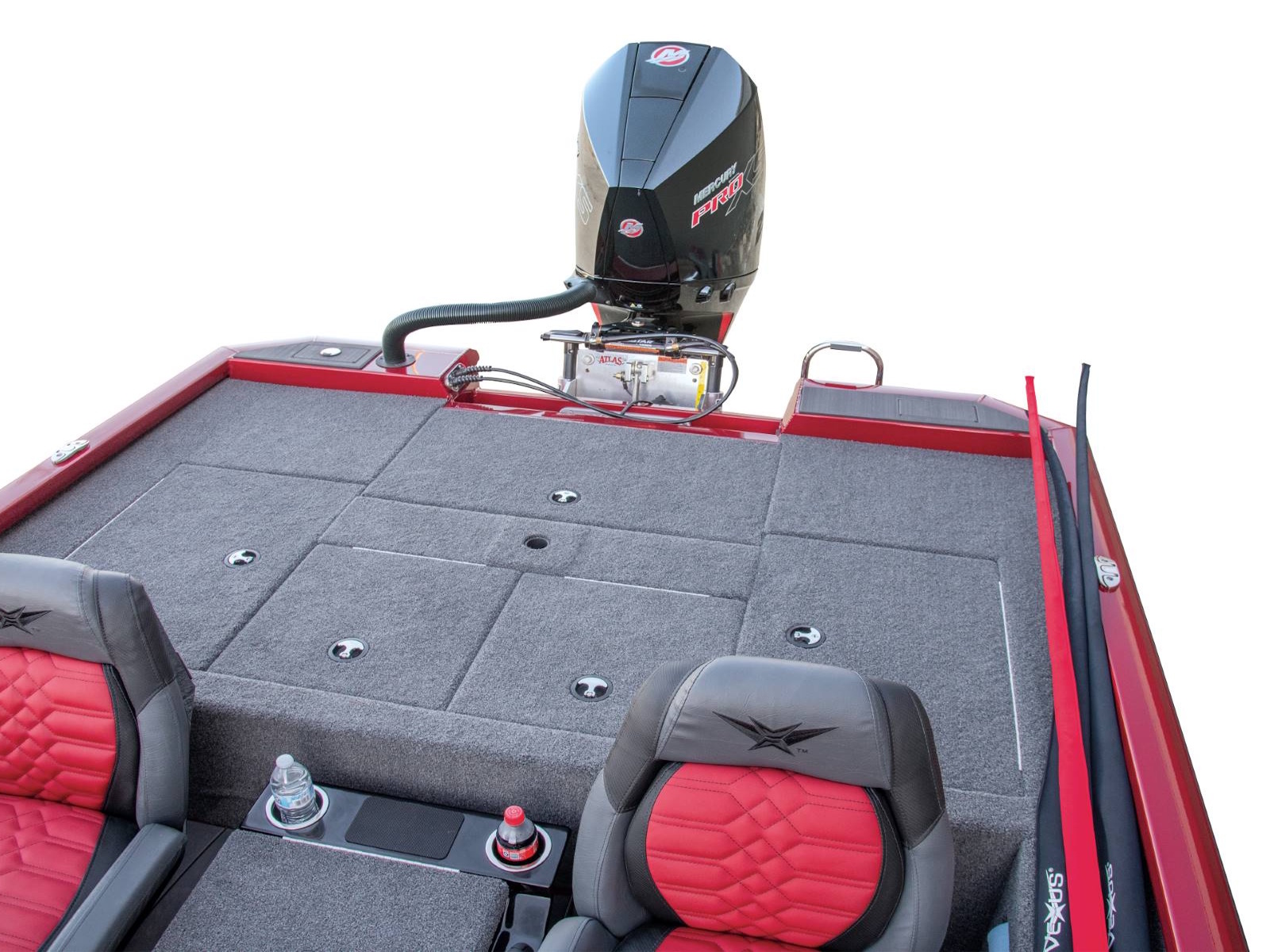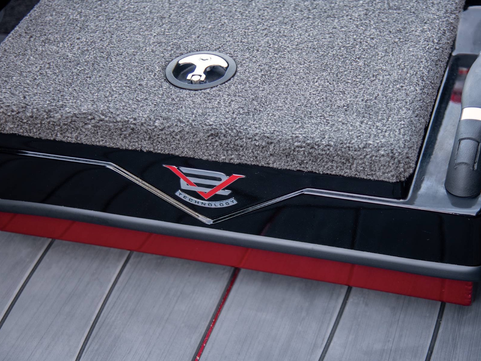 Centering the rear deck, our tournament-engineered, fiberglass livewell is equipped with recirculating aeration, filter screens, an anti-splash ring, removable divider, and a pump-out feature. Surrounding the well are a pair of huge, insulated fiberglass storages. Deep, wide, and long, these compartments feature compression lid latches, raised lips with rubber trim seals, and gutter drains to reinforce our Dri-Max® system of rapid water evacuation on both decks. At the stern, the rear power compartment is set up for easy access to pumps and plumbing, a multi-bank charger, circuit breakers, master power switch, our Vexus® View 8-gauge inline harness, and batteries.