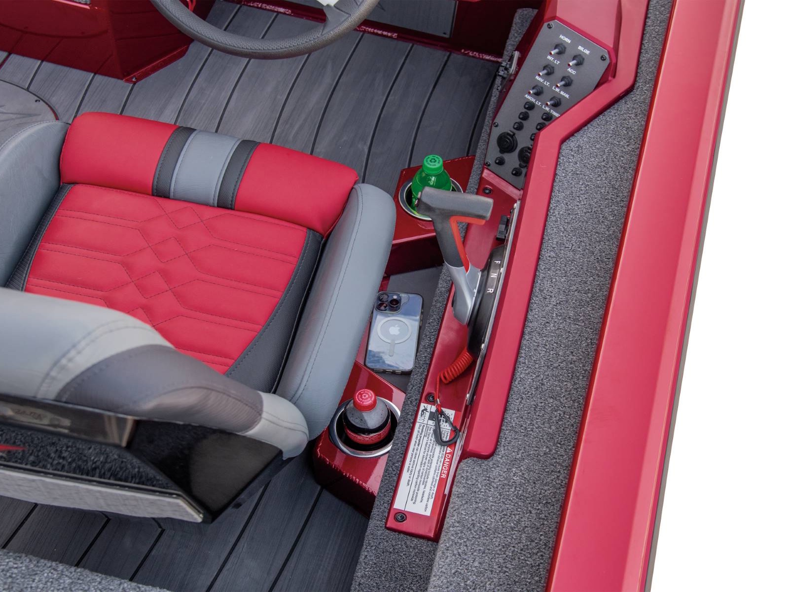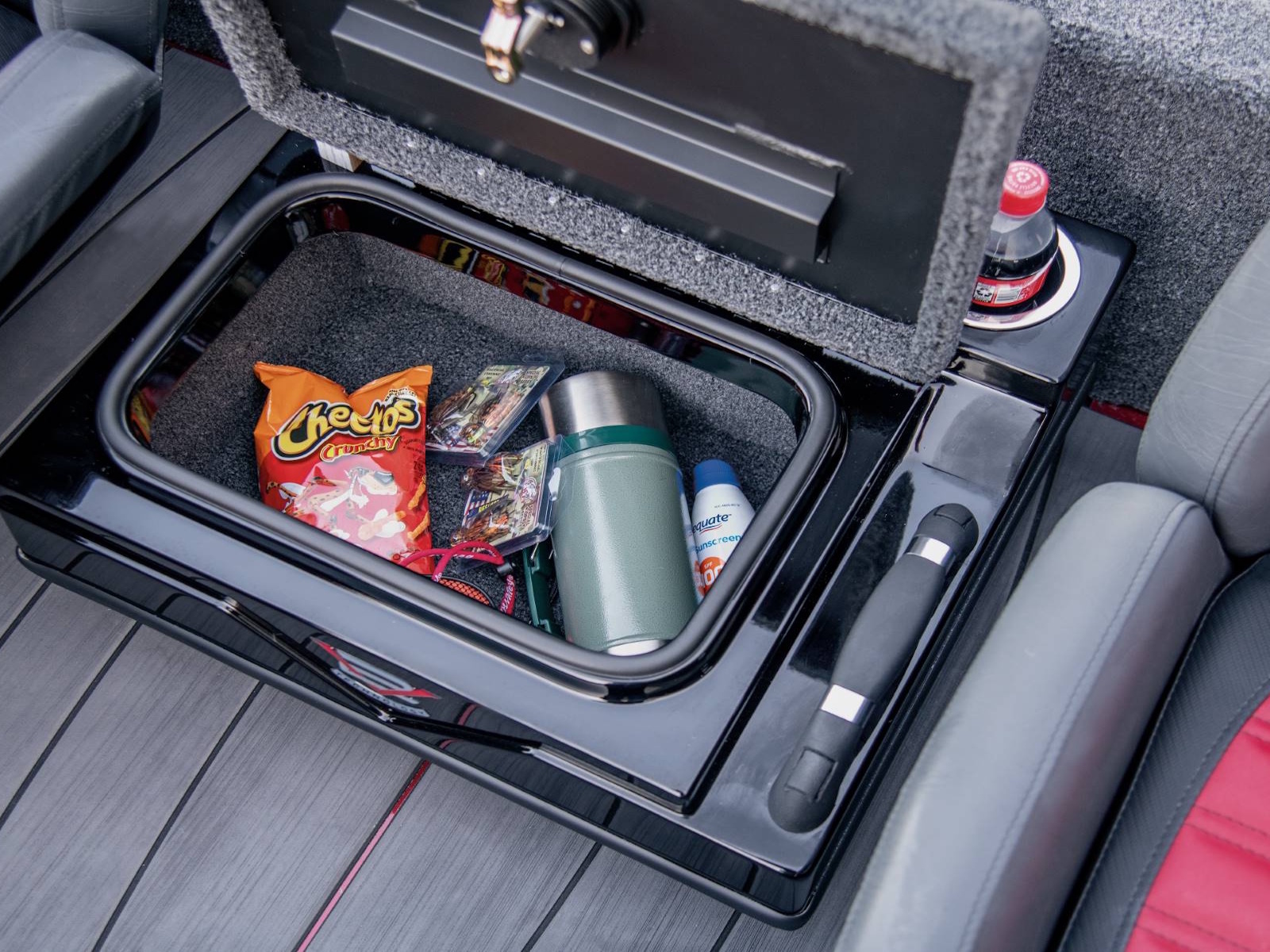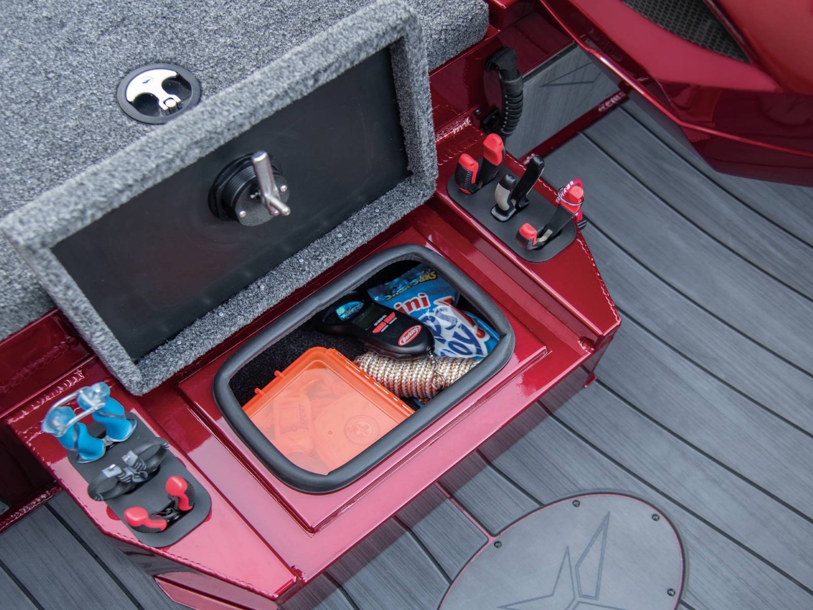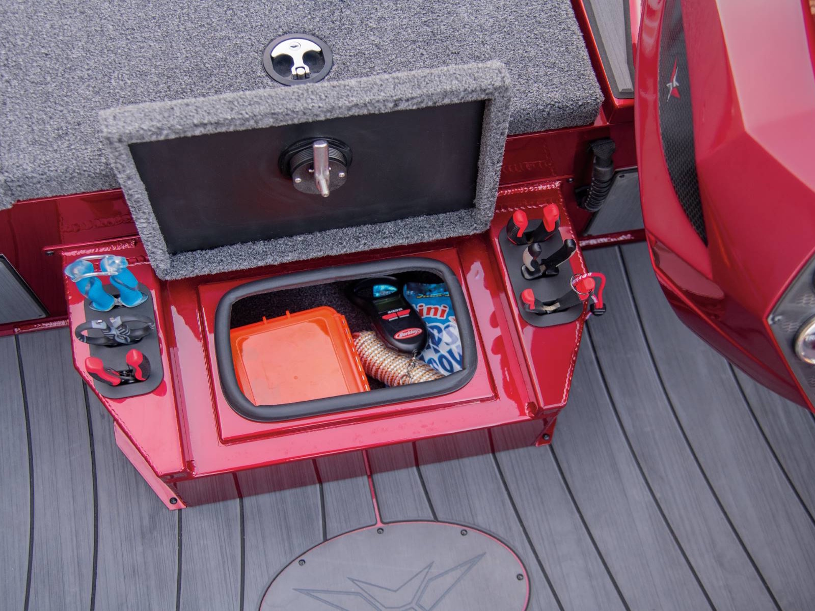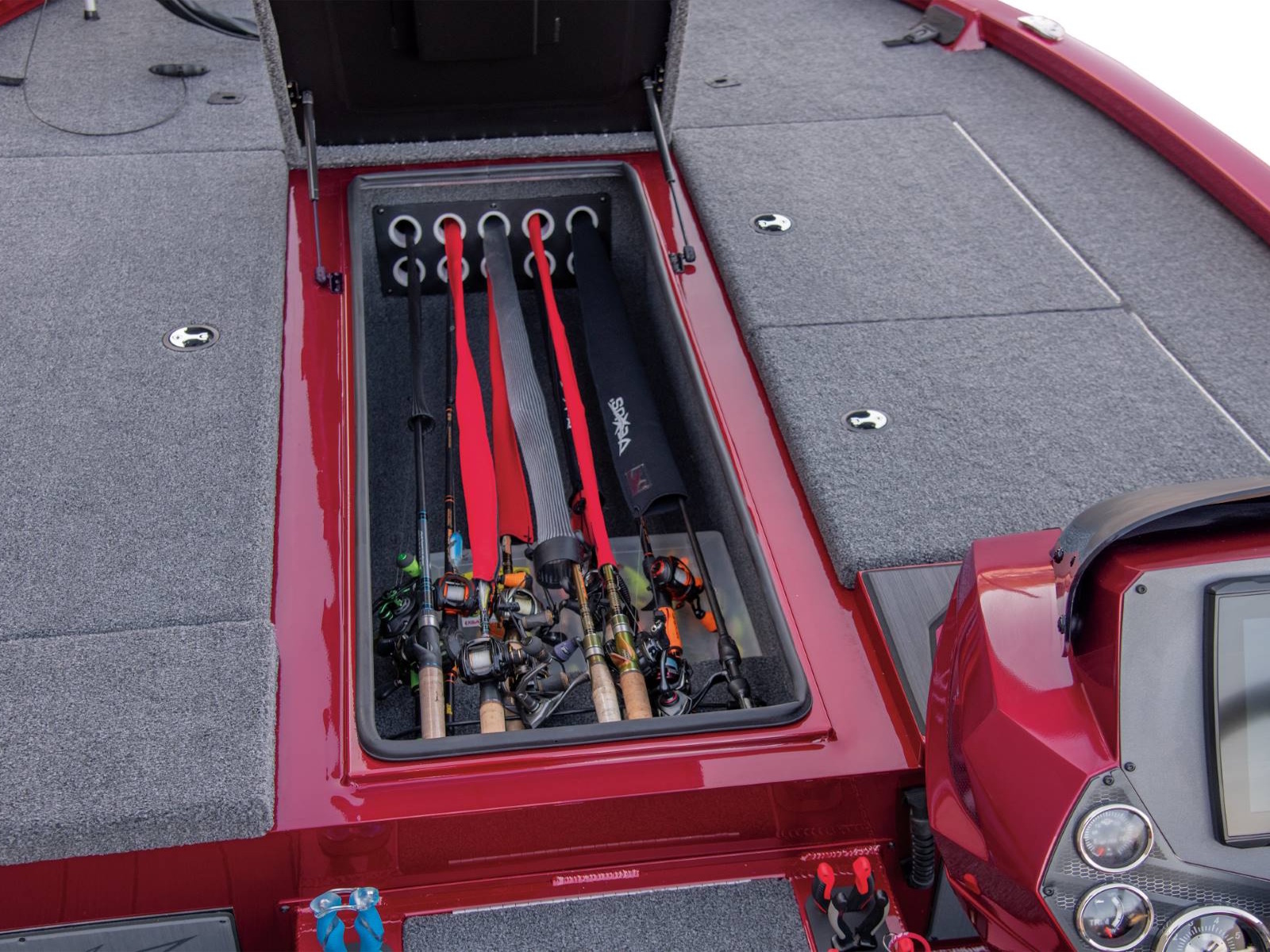 There’s room for 3-across seating on the forward deck as well as an absolute arsenal of rods and gear throughout the interior. Up front, the port side locker includes space for sticks up to 8 ½ feet in length while the center box can hold 9-foot rods. There’s even a space below the rods for 3700-sized tackle boxes and a bump board is fitted under the painted lid. Plus, the ultra-wide decks are fitted with full-size rod hold-downs and open slots alongside the gunnels so you can keep a multitude of rods within arm’s reach. Just in front of the helm, the oversized starboard compartment is ideal for lifejackets and other gear while also featuring a partition. The arrangement works well as a day box, making it easy to quickly reach the tackle you’re leaning on.