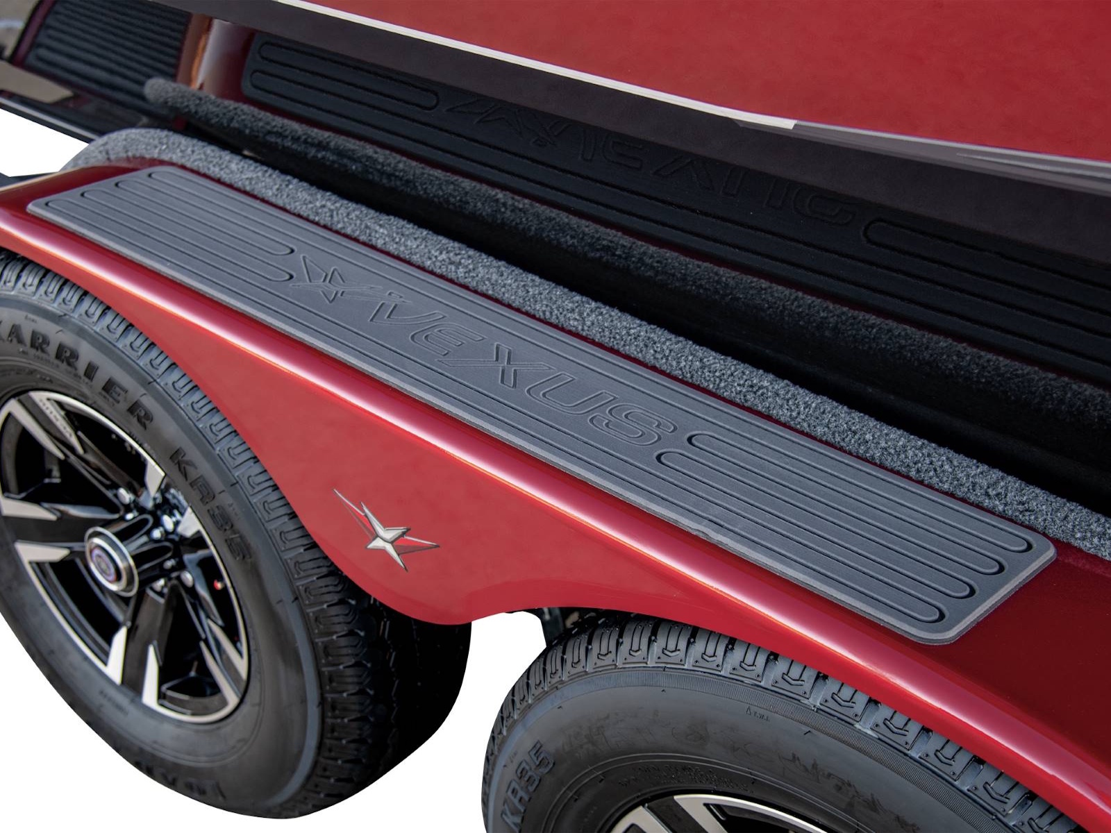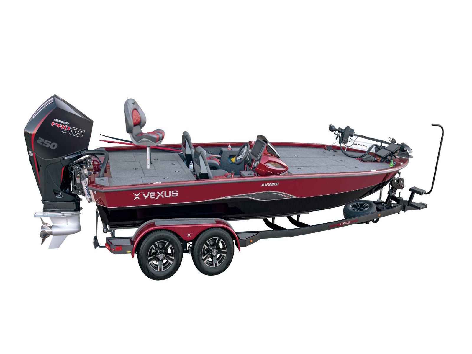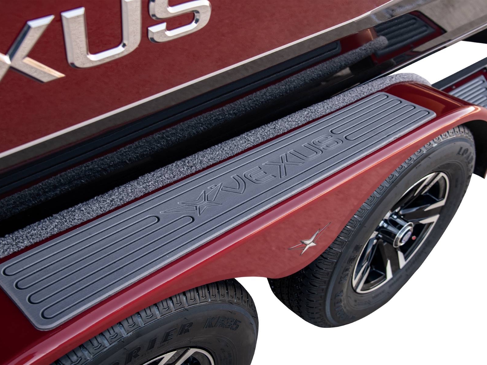 Cradling the 2100 is a factory-fitted, precision-matched trailer that’s loaded with even more standard features. Check out the reinforced 4-inch channel steel frame, Victor Shield™ protective coating, LED lighting, disc brakes on both axles, swing tongue, hybrid oil hubs, custom aluminum Vexus® branded wheels, fitted bunks, load guides, transom tie-downs, spare tire and wheel, multiple side steps, and an available bow step.