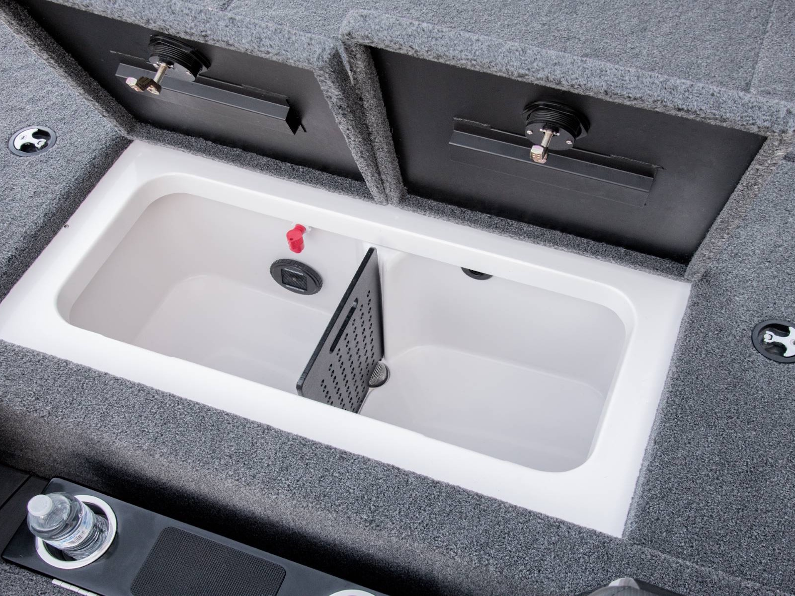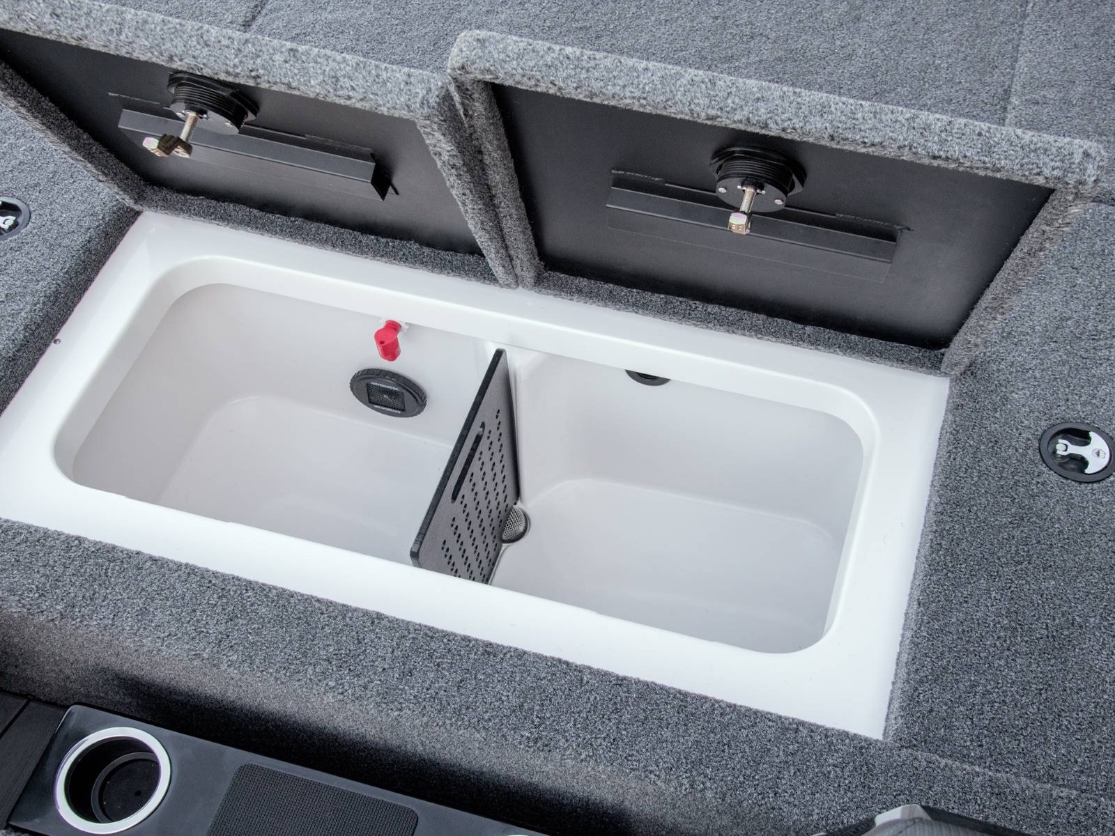 - Tournament-Grade Fiberglass Livewell with Aeration, Anti-Splash Ring, Divider, and Pump-Out