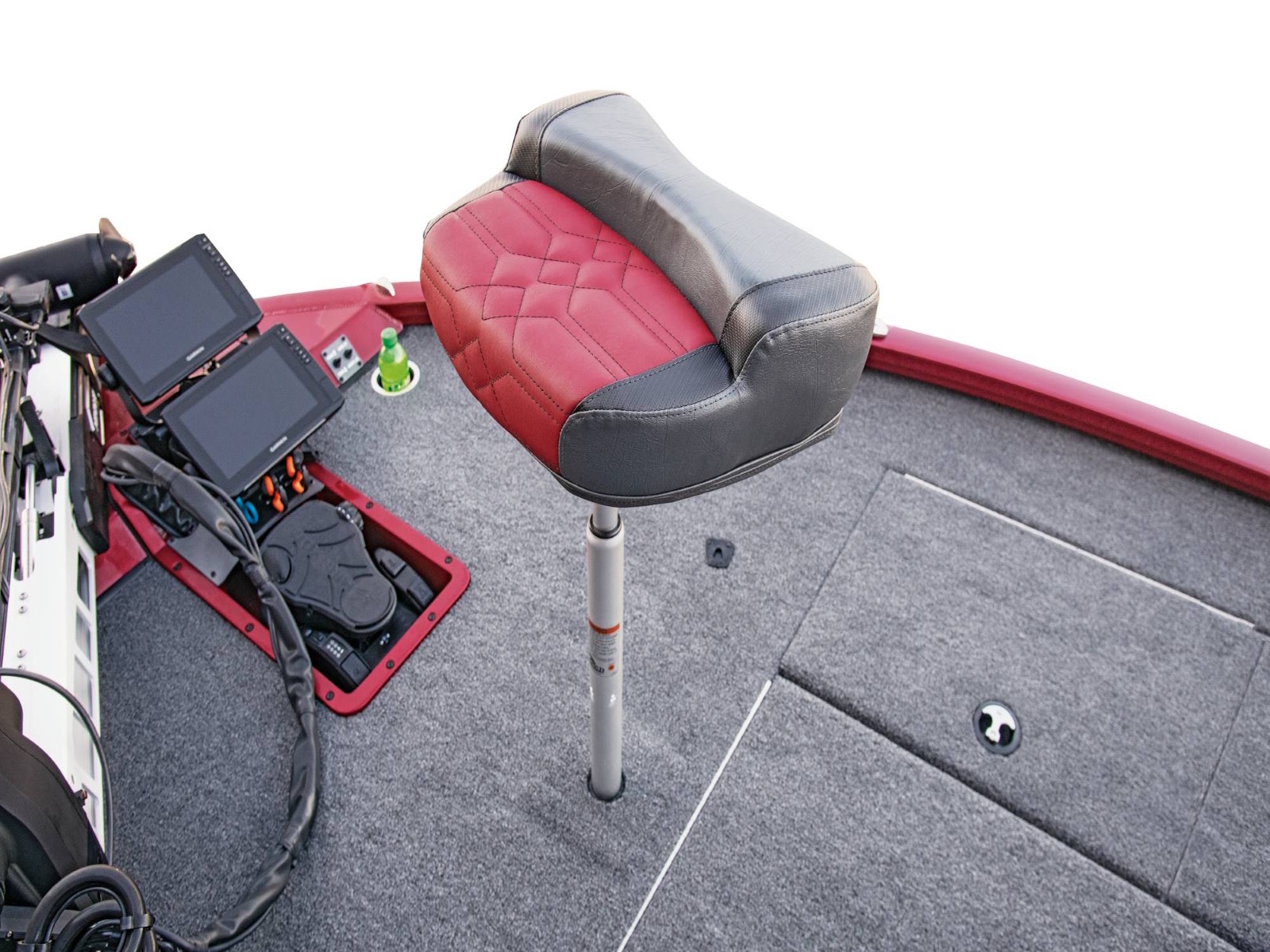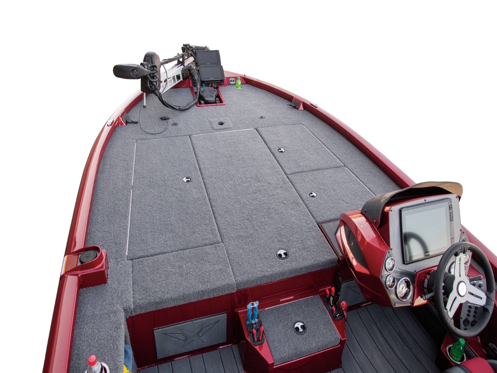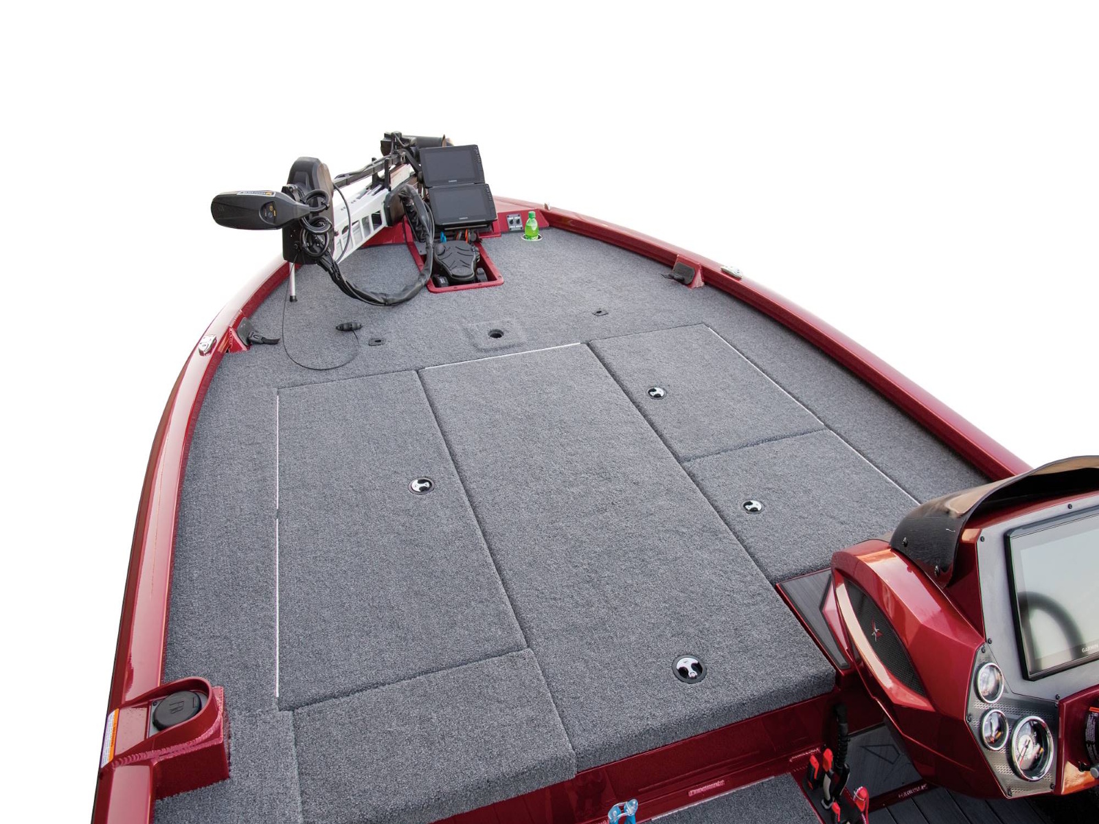 With plenty of room for multiple anglers up front, the forward workstation is equally spacious. Cup and toolholders combine with a recessed fiberglass well for the trolling motor pedal, integrated NAV lights, and remote switches. From large flush-mount electronics to even larger stacked units, this rig is built for business.