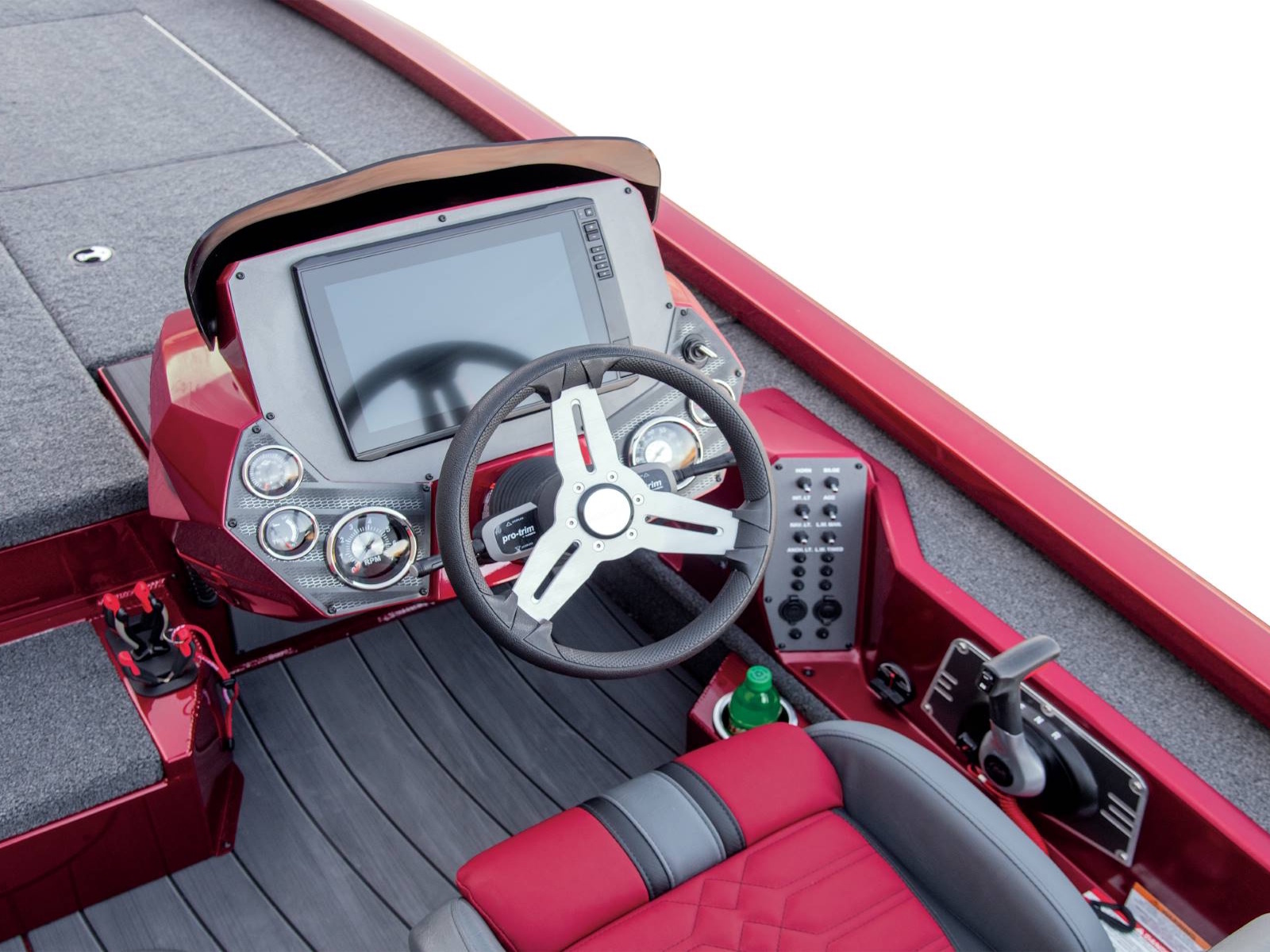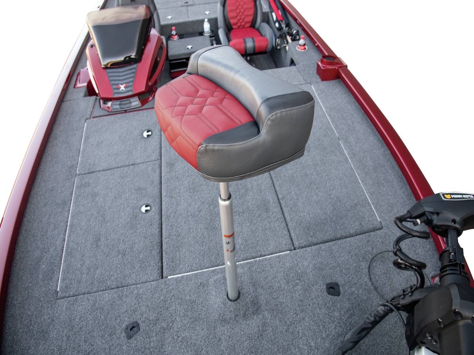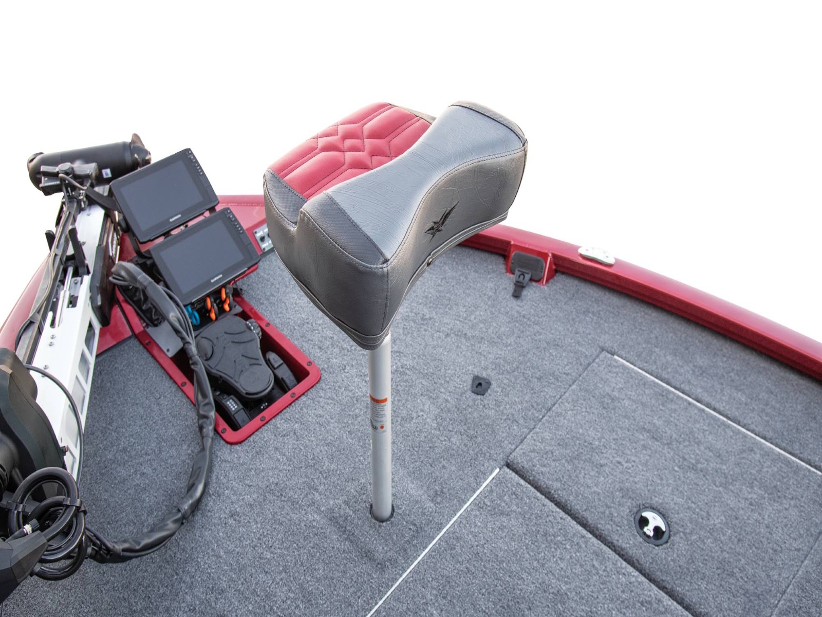 With plenty of room for multiple anglers up front, the forward workstation is equally spacious. Cup and toolholders combine with a recessed fiberglass well for the trolling motor pedal, integrated NAV lights, and remote switches. From large flush-mount electronics to even larger stacked units, this rig is built for business.