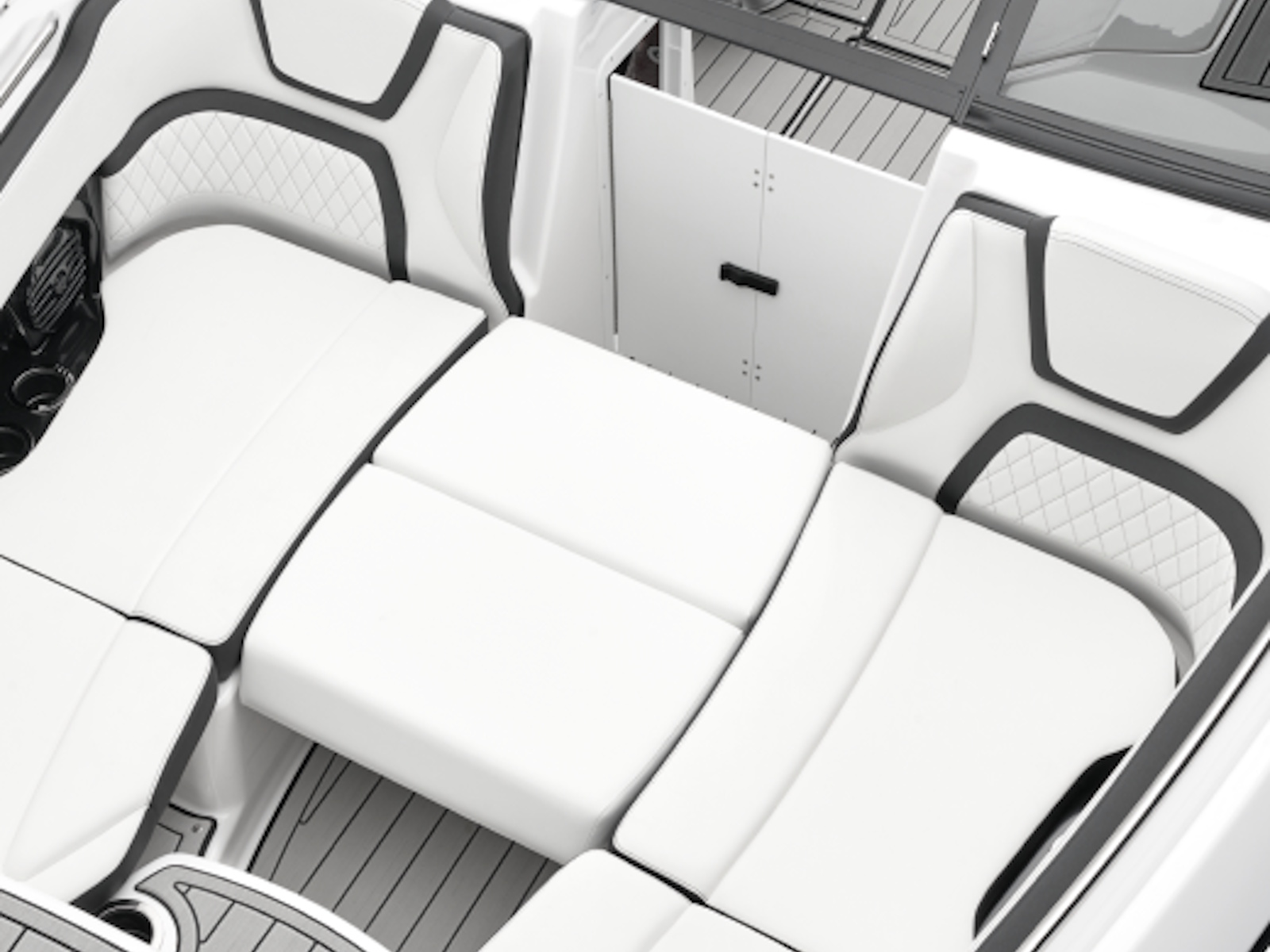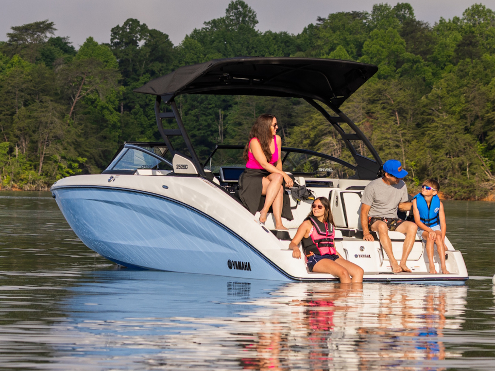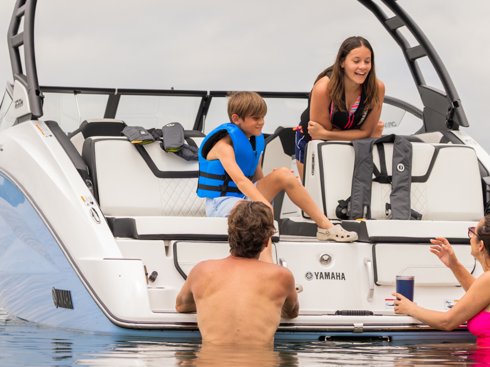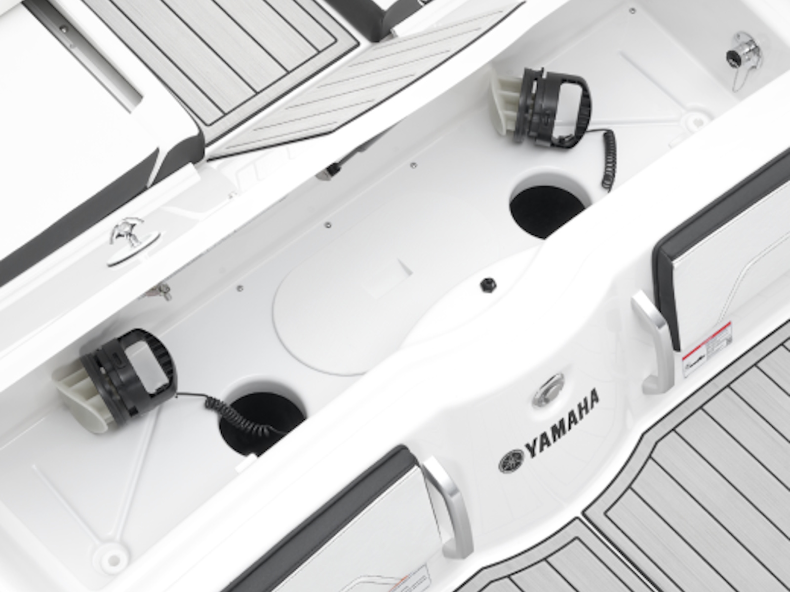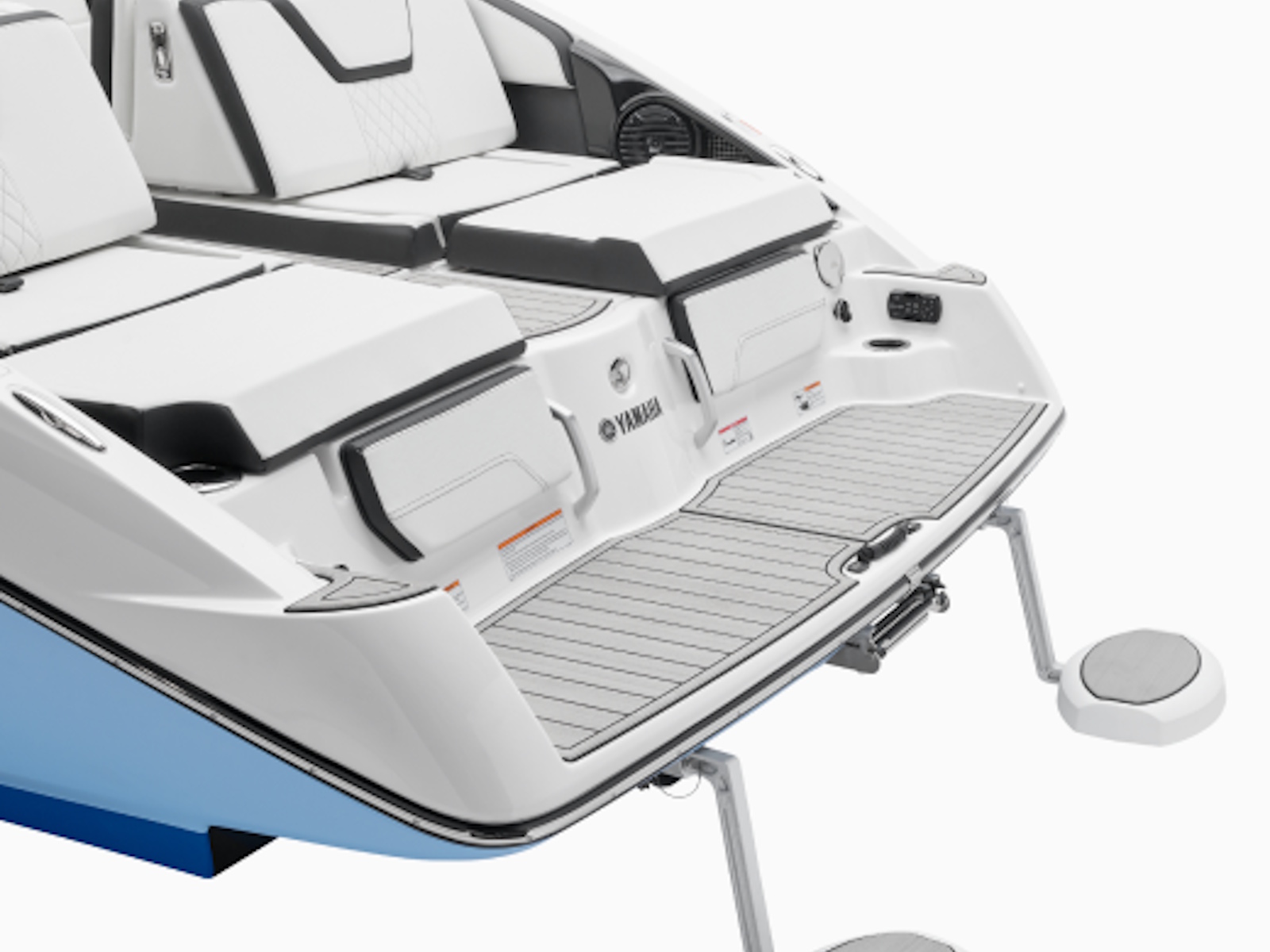 Yamaha's innovative swim-up seating transforms the stern into a comfortable lounge area that includes beverage mounts, plush backrest cushions, and easy access to the patented jet pump cleanout ports.