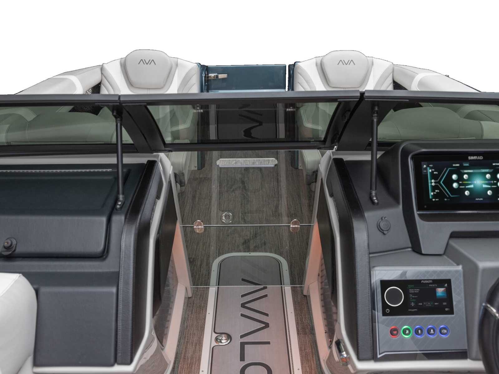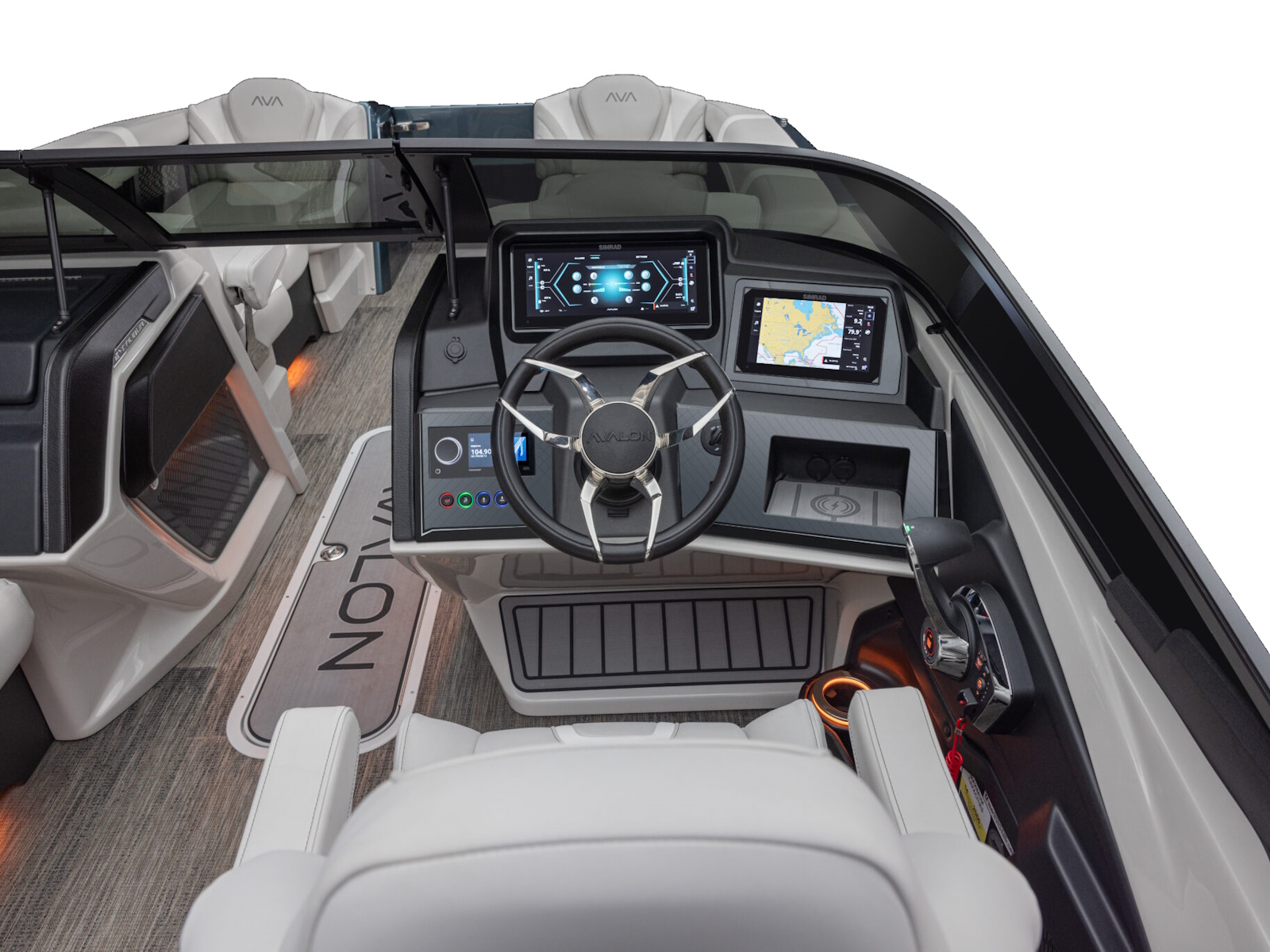 - Dual Admiral III fiberglass helmstands with full windshield, Simrad ultra-wide NSX12 & NSX9 multi-function touchscreen digital dash panel, USB charging ports & light controls