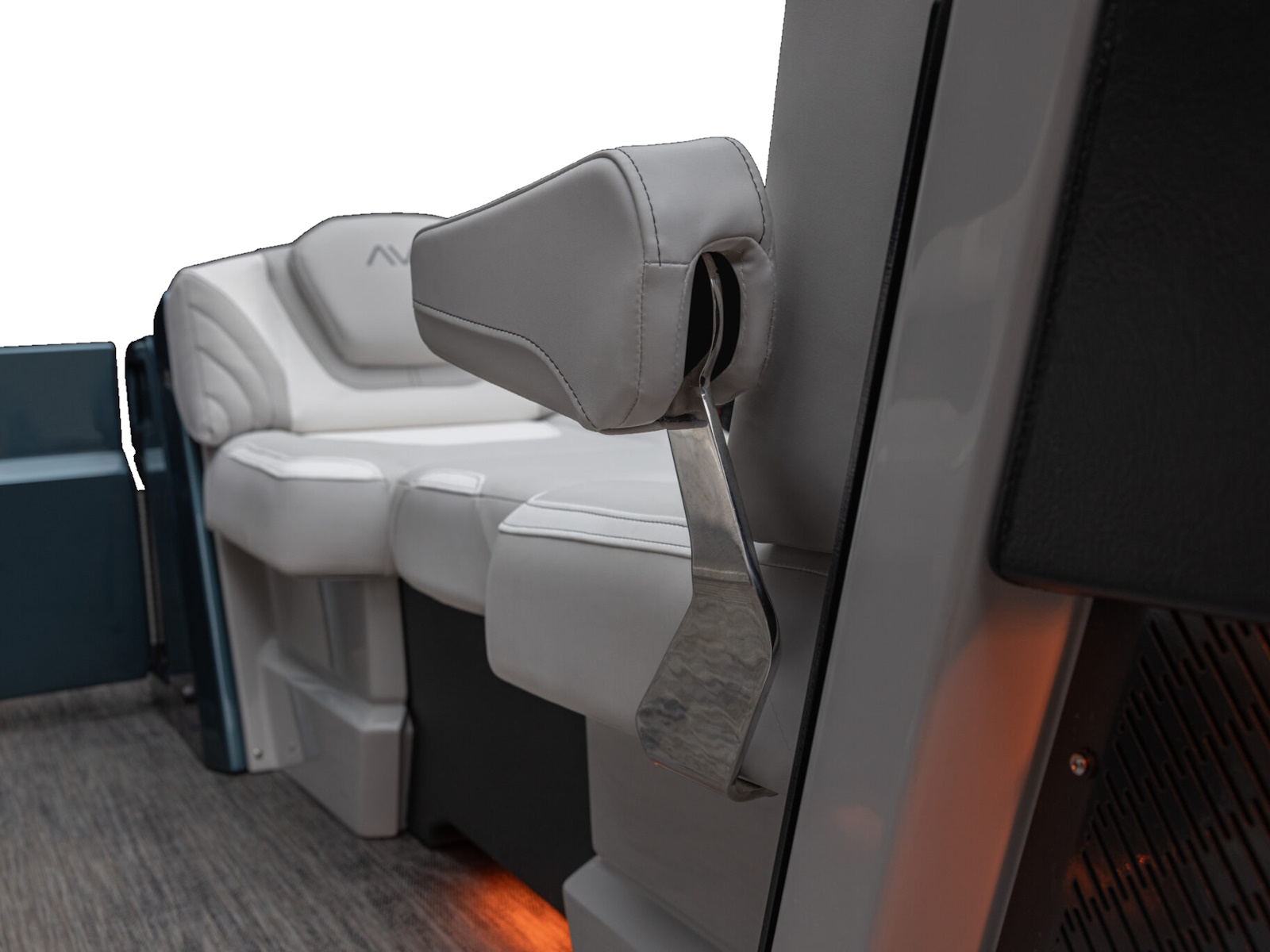 Mariner high back reclining driver’s chair with flip-up bolster & color-matched accents | Chair adjustment slider, front, back, rotate | 8000 Series furniture with Ultrafine touch seat vinyl & quilted accents | Suspension seating
